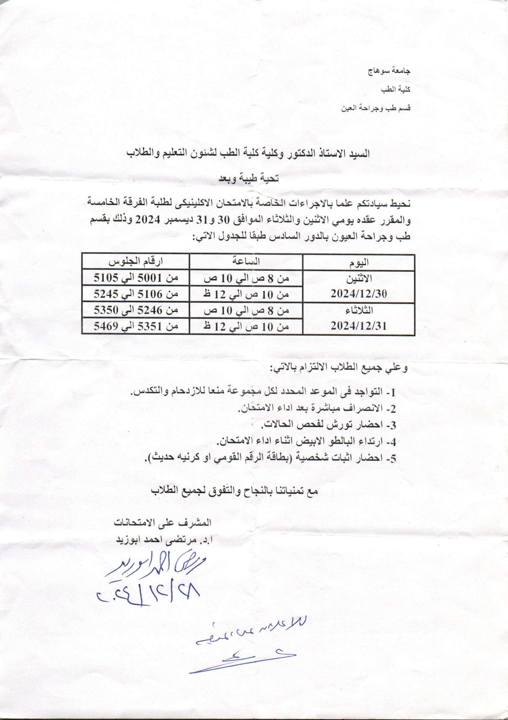 الرئيسية » Blog » اعلان هام لطلبة الفرقة الخامسة تويزع طلاب الامتحان الاكلينيكياعلان هام لطلبة الفرقة الخامسة تويزع طلاب الامتحان الاكلينيكيby كلية الطب2024-12-30