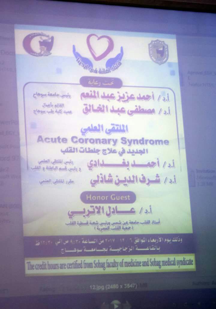 تحت رعاية السيد الاستاذ الدكتور/ أحمد عزيز رئيس الجامعة والسيد الأستاذ الدكتور/ مصطفي عبد الخالق عميد كلية الطب وبإستضافة الاستاذ الدكتور/ عادل الاتربي أستاذ القلب جامعة عين شمس ورئيس شعبة قسطرة القلب (جمعية القلب المصرية )تنظم كلية الطب جامعة سوهاج الملتقى العلمى “الجديد في علاج جلطات القلب”