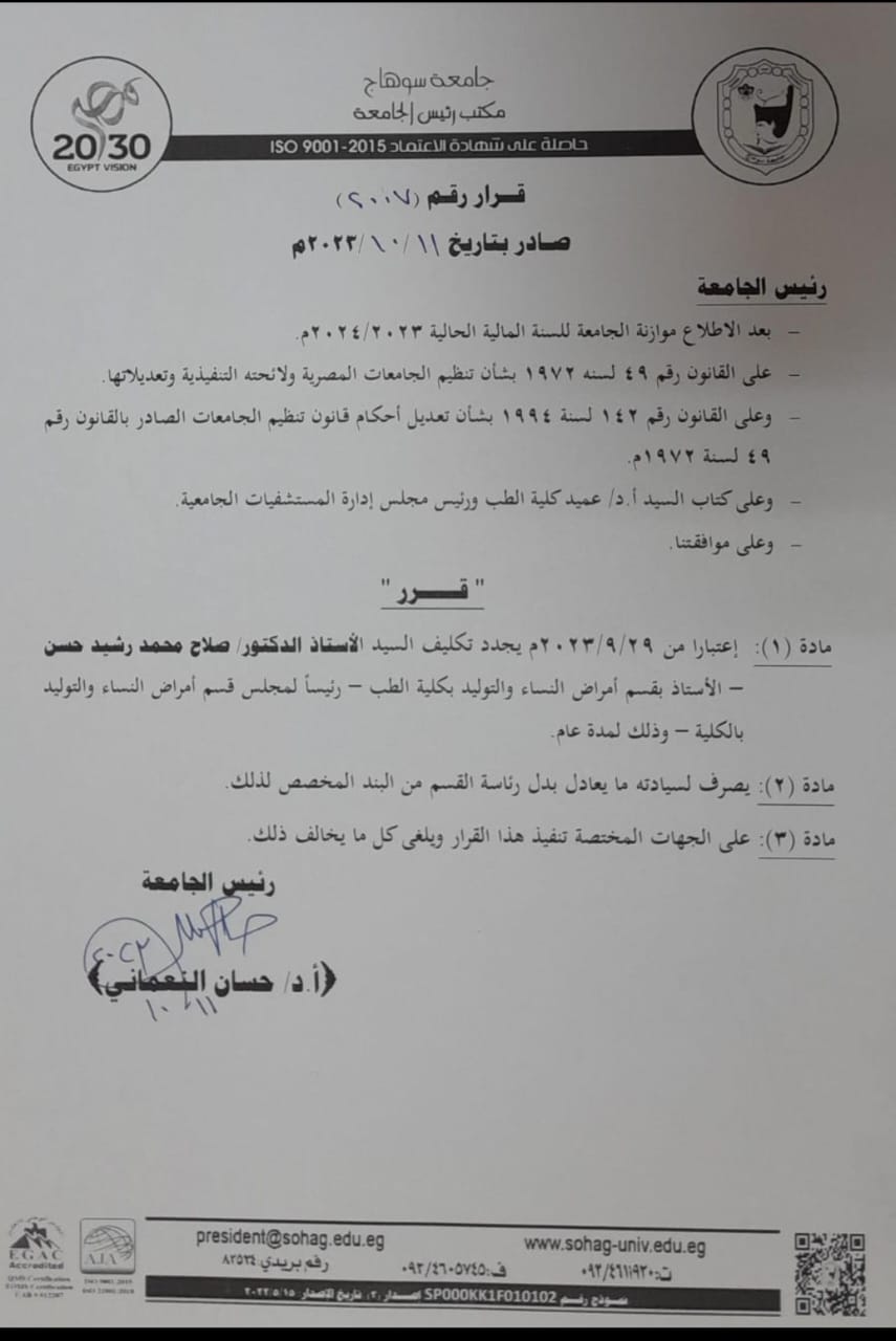 أجمل التهاني القلبية مقدمة من أسرة كلية الطب البشري جامعة سوهاج الي أ.د/ صلاح محمد رشيد حسن – أستاذ بقسم أمراض النساء والتوليد بكلية الطب البشري بمناسبة صدور قرار معالي السيد أ.د/ حسان النعماني رئيس جامعة سوهاج بتجديد تكليفه رئيسا لمجلس قسم أمراض النساء والتوليد بالكلية وذلك لمدة عام.