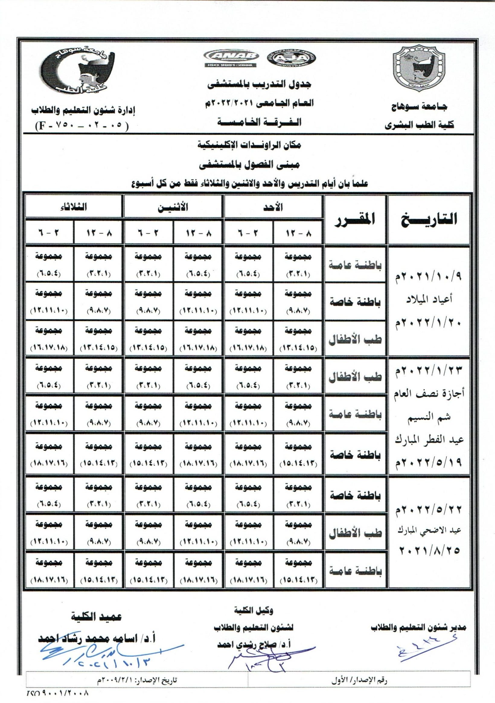 جدول التدريب بالمستشفى – الفرقة الخامسة العام الجامعي 2021/2022