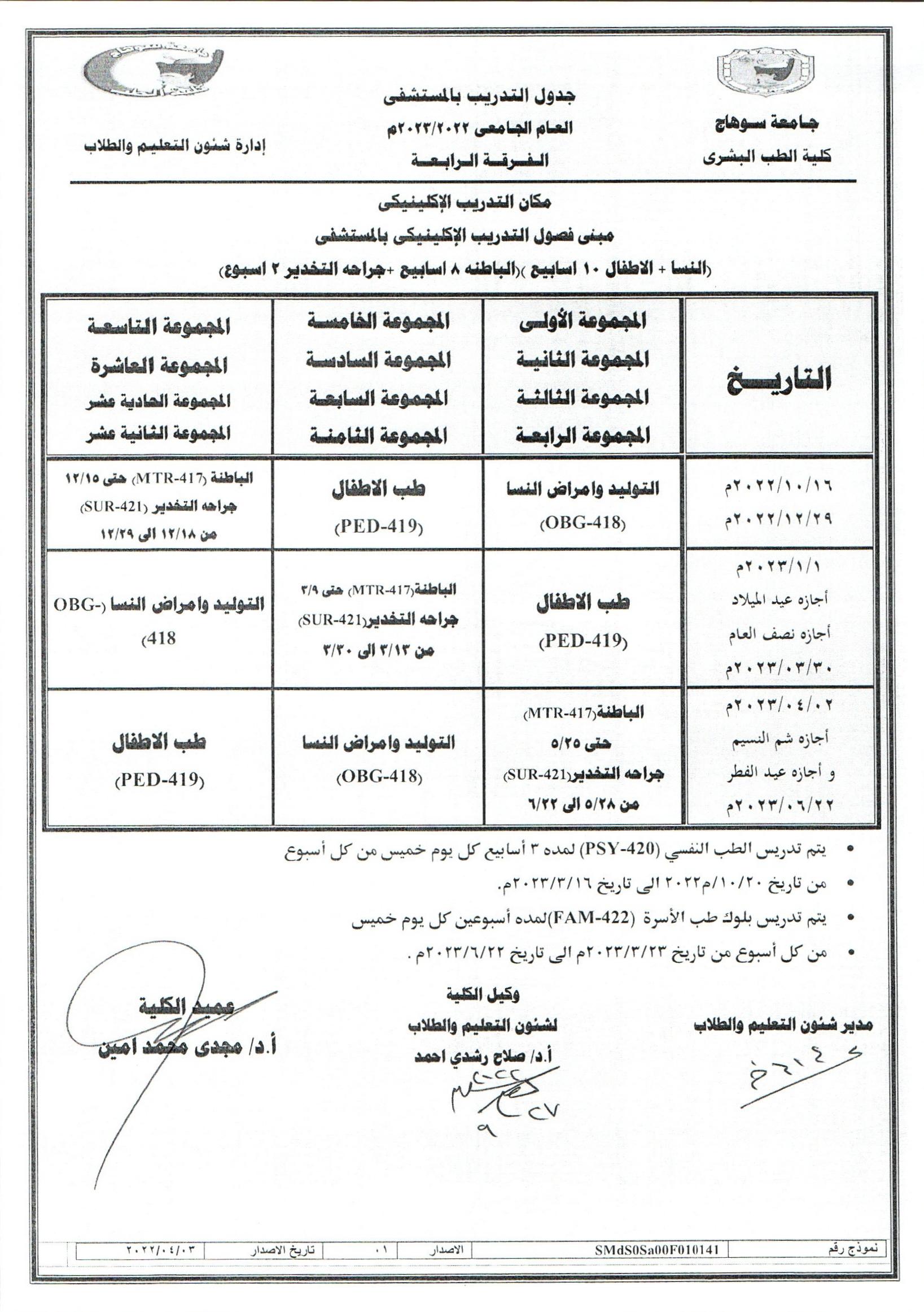جدول التدريب بالمستشفى للفرقة الرابعة العام الجامعي 2022/2023