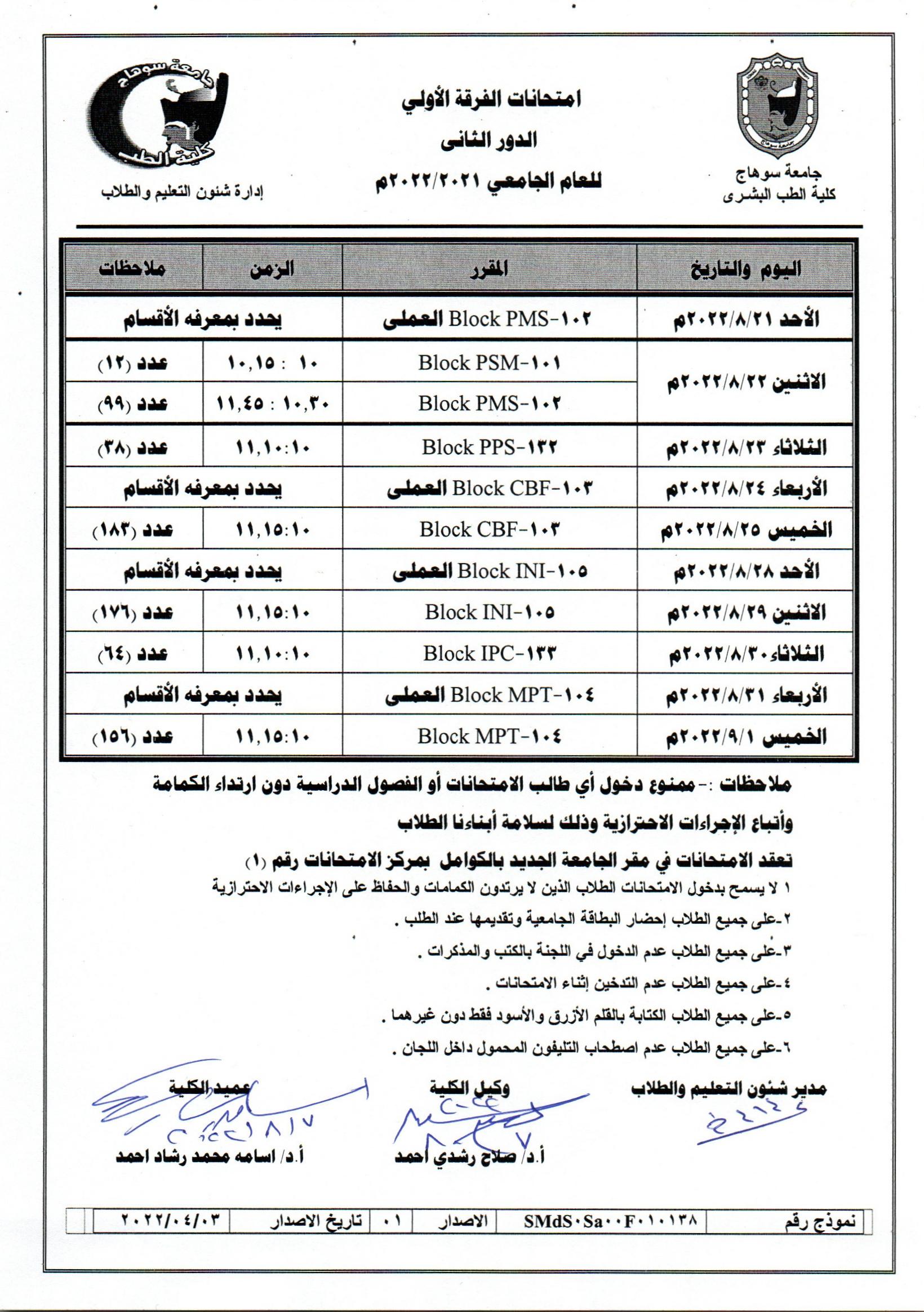 جدول امتحانات الدور الثاني للفرقة الاولى الفصل الدراسي الثاني 2021/2022
