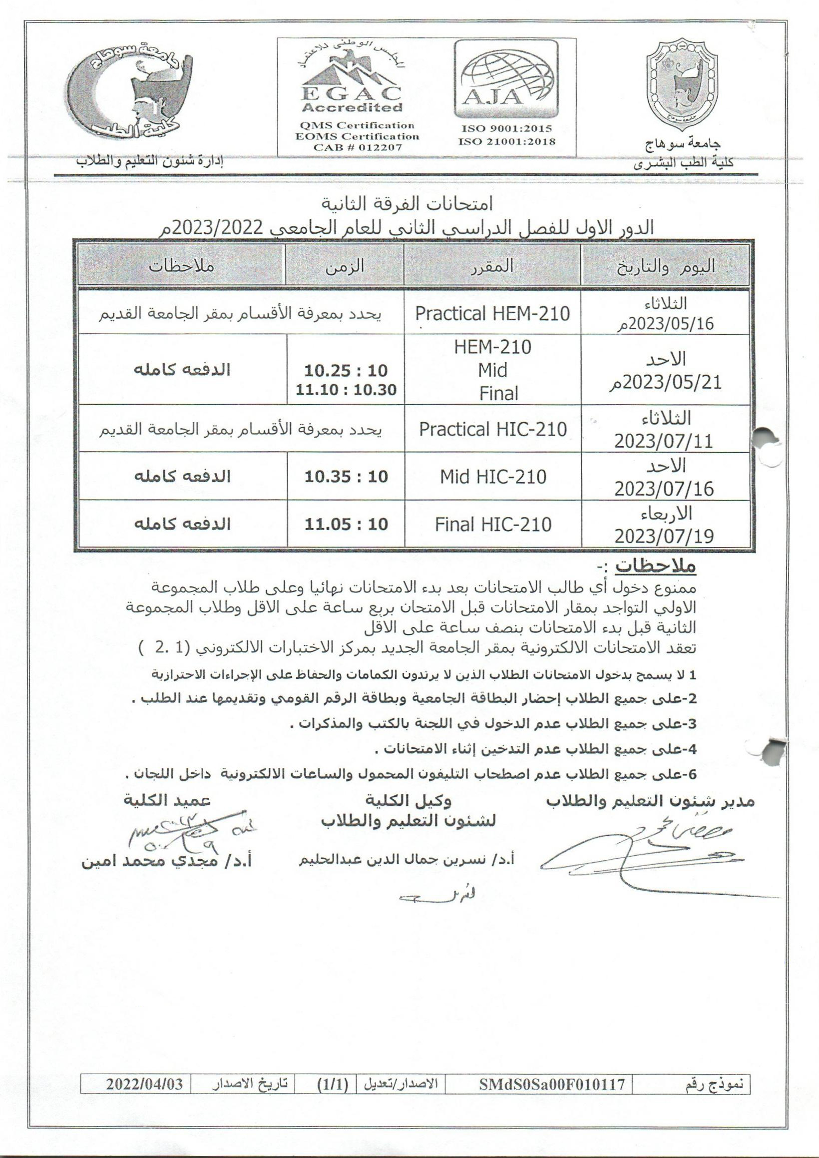 جدول امتحانات الفرقة الثانية الدور الاول للفصل الدراسي الثاني العام الجامعي 2022/2023