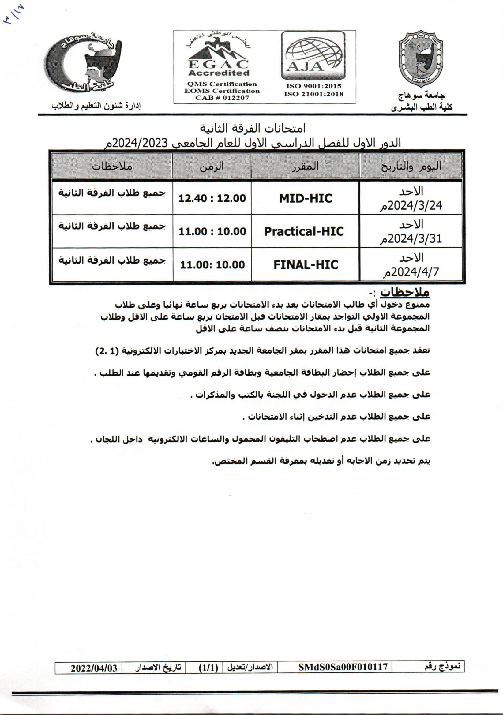 جدول امتحانات الفرقة الثانية Block HIC الدور الاول للفصل الدراسي الثاني العام الجامعي 2023/2024