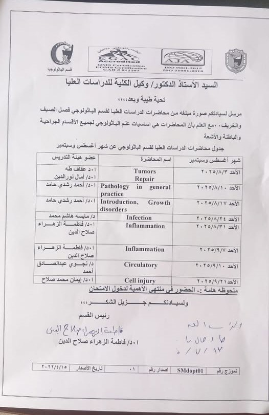 الرئيسية » Blog » جدول محاضرات الدراسات العليا لقسم الباثولوجي عن شهري اغسطس و سبتمبر 2025جدول محاضرات الدراسات العليا لقسم الباثولوجي عن شهري اغسطس و سبتمبر 2025by كلية الطب2025-07-142025-07-14