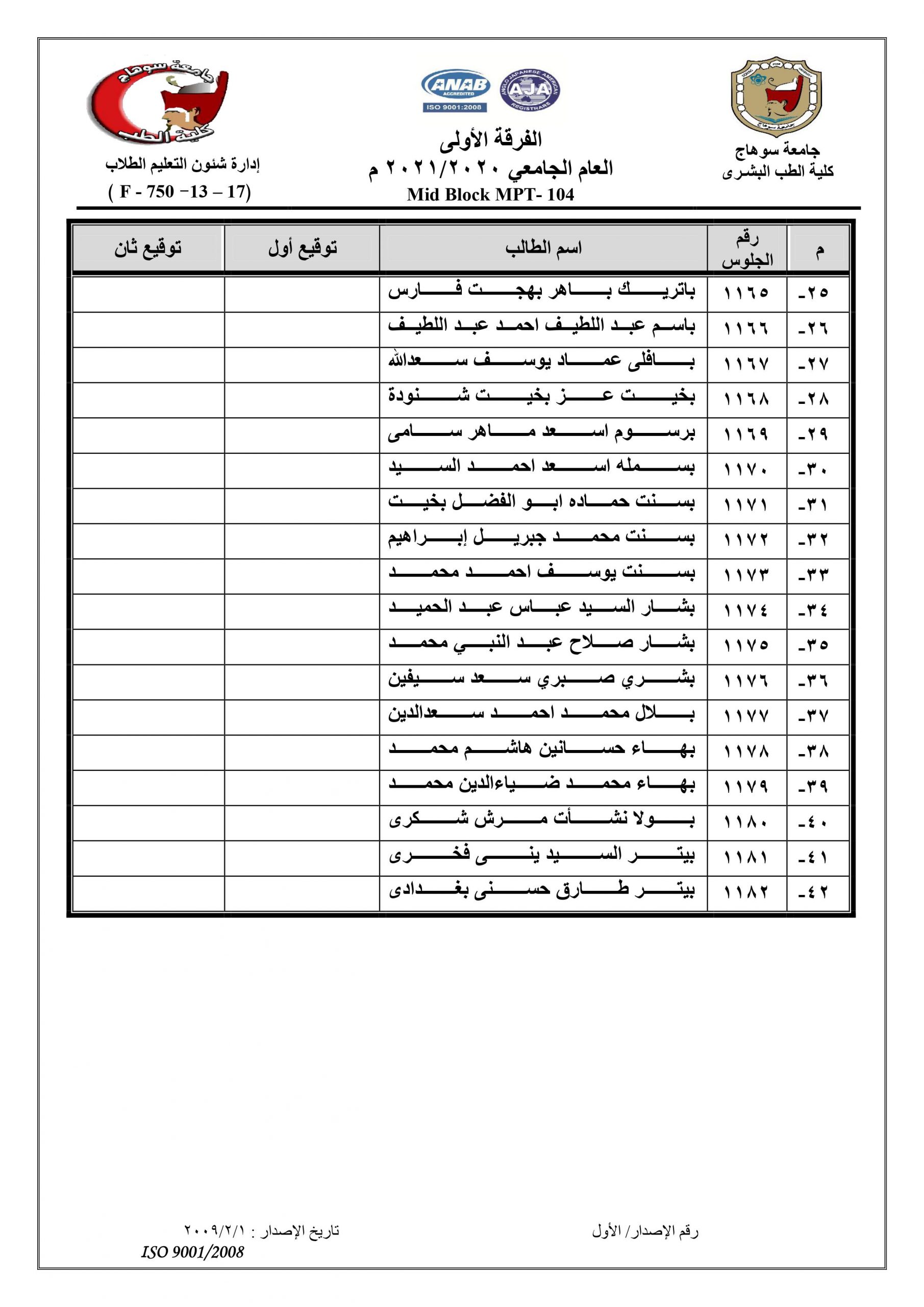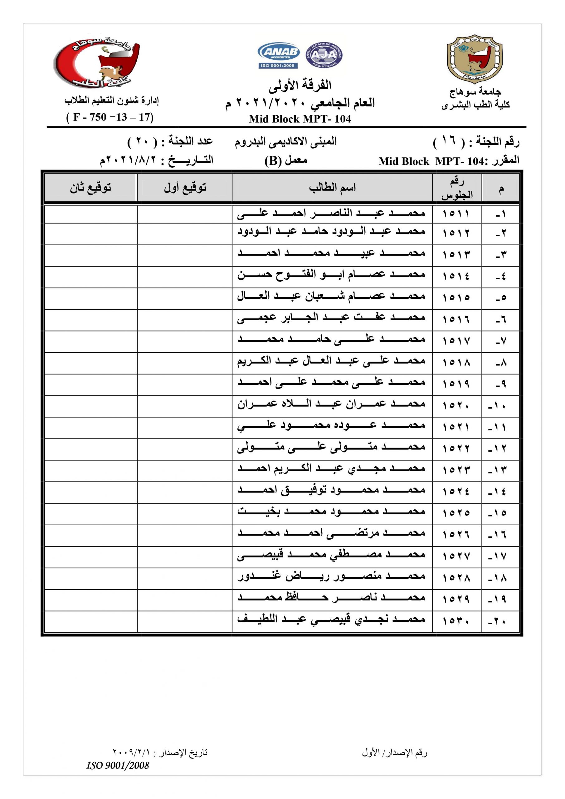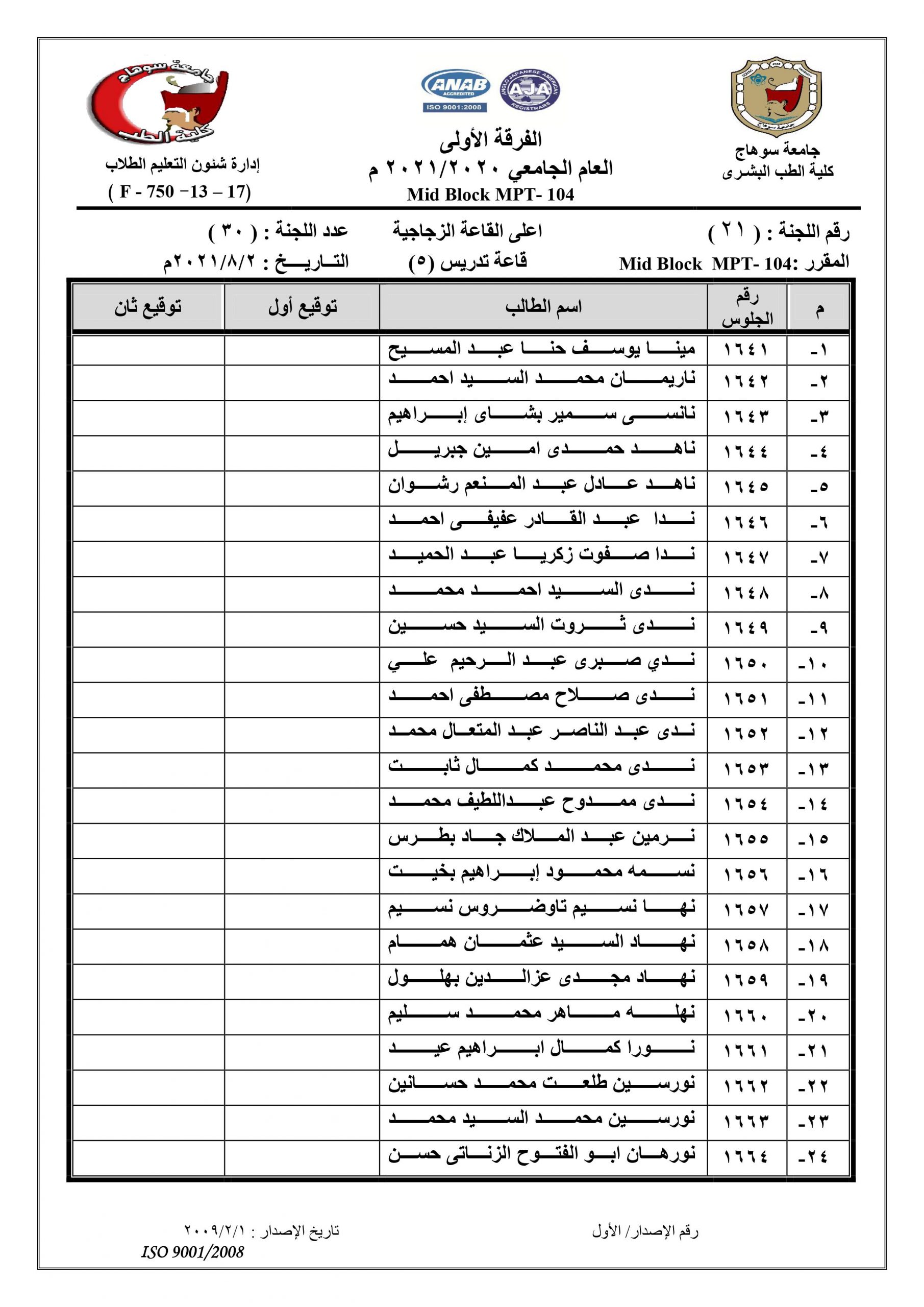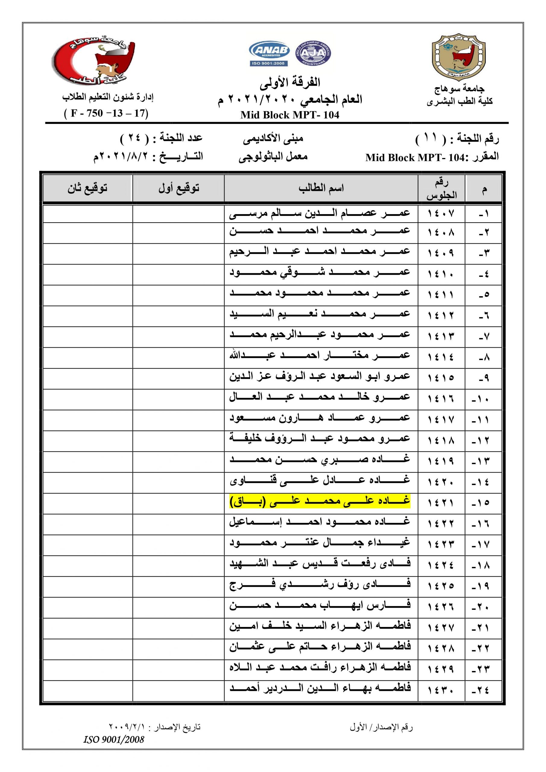 دليل امتحانات الفرقة الاولى العام الجامعي 2020/2021 م (عملي فارماكولوجي MPT)