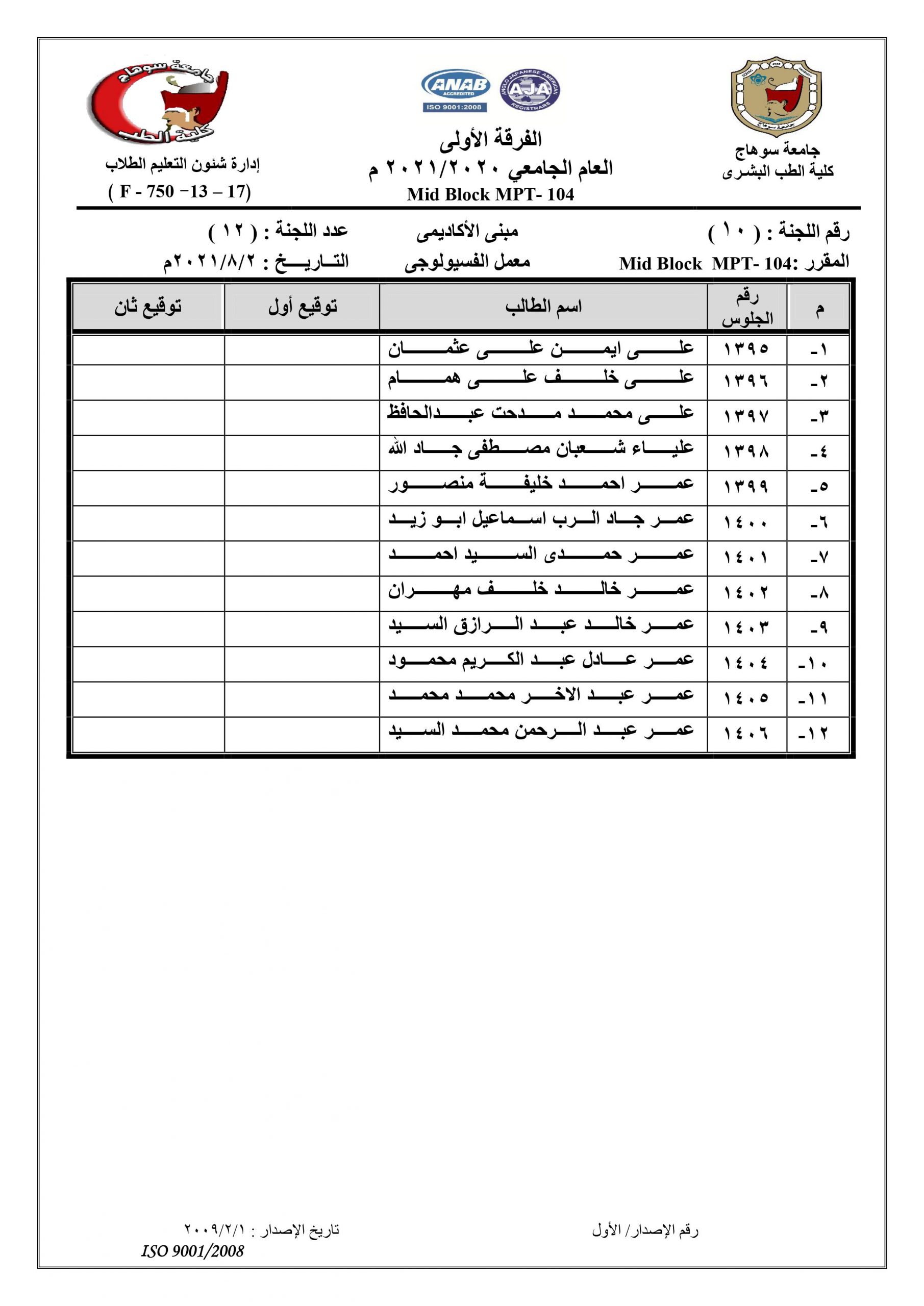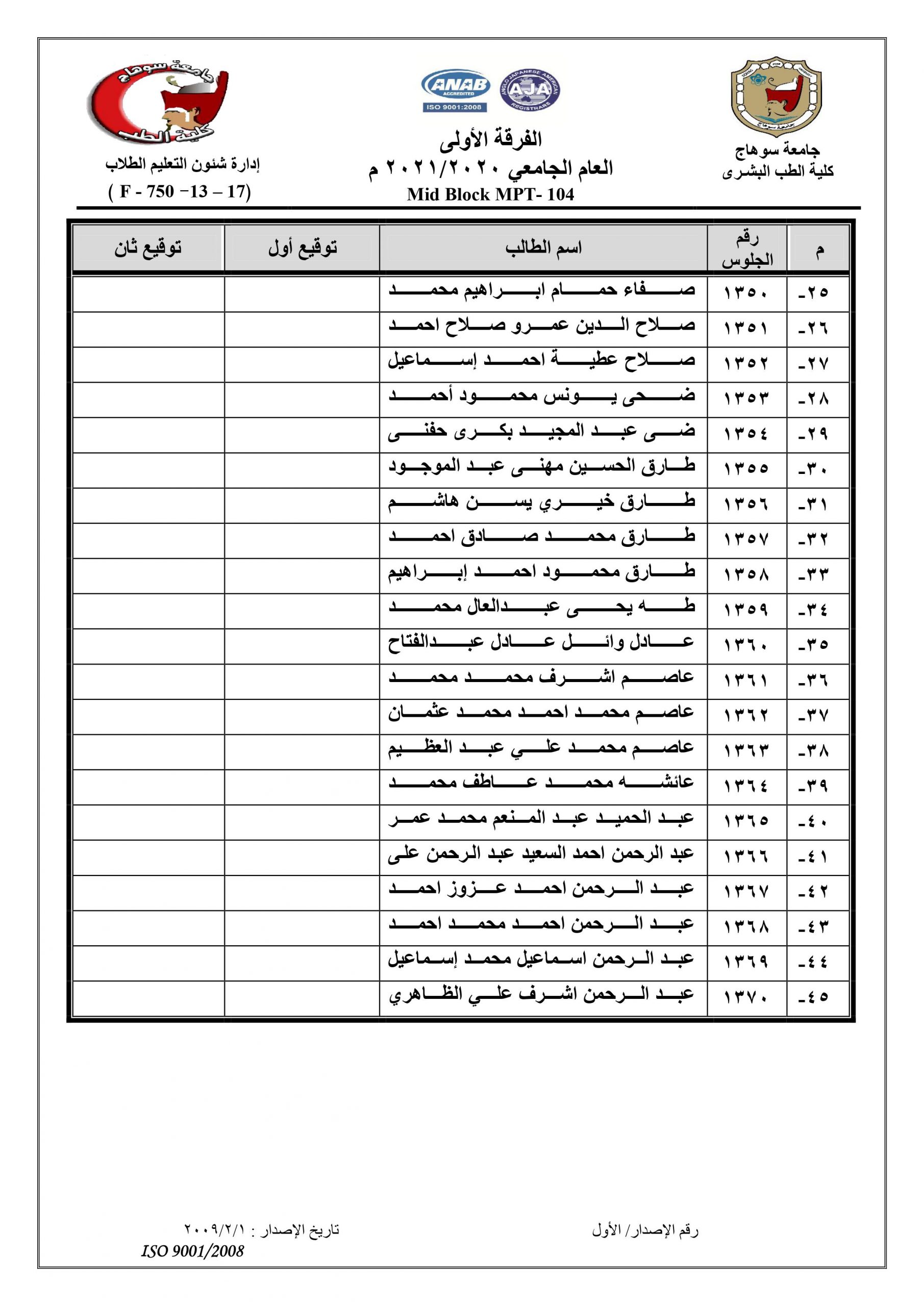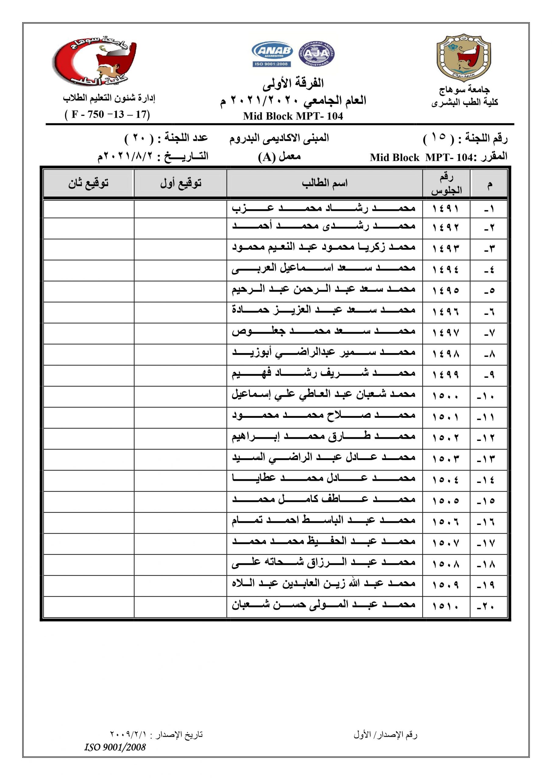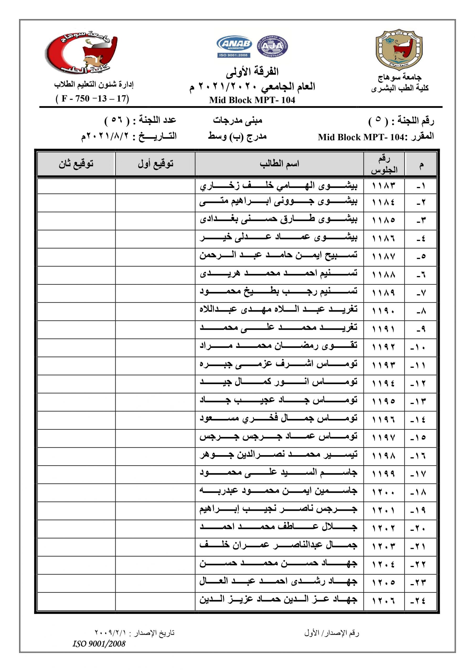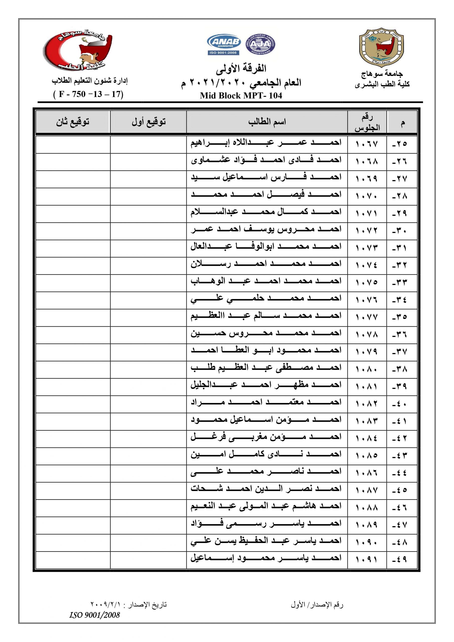 دليل امتحانات الفرقة الاولى العام الجامعي 2020/2021 م (عملي فارماكولوجي MPT)
