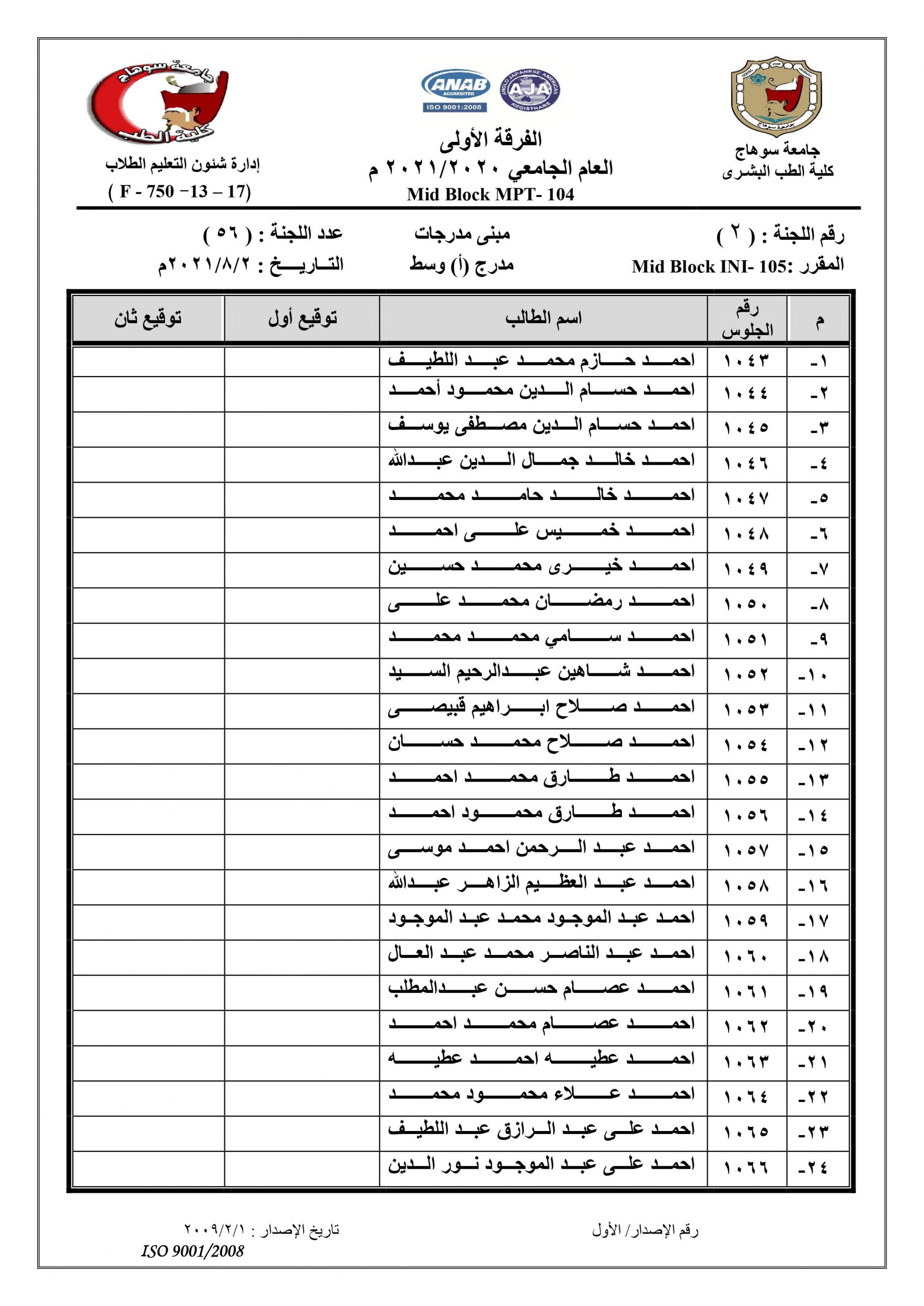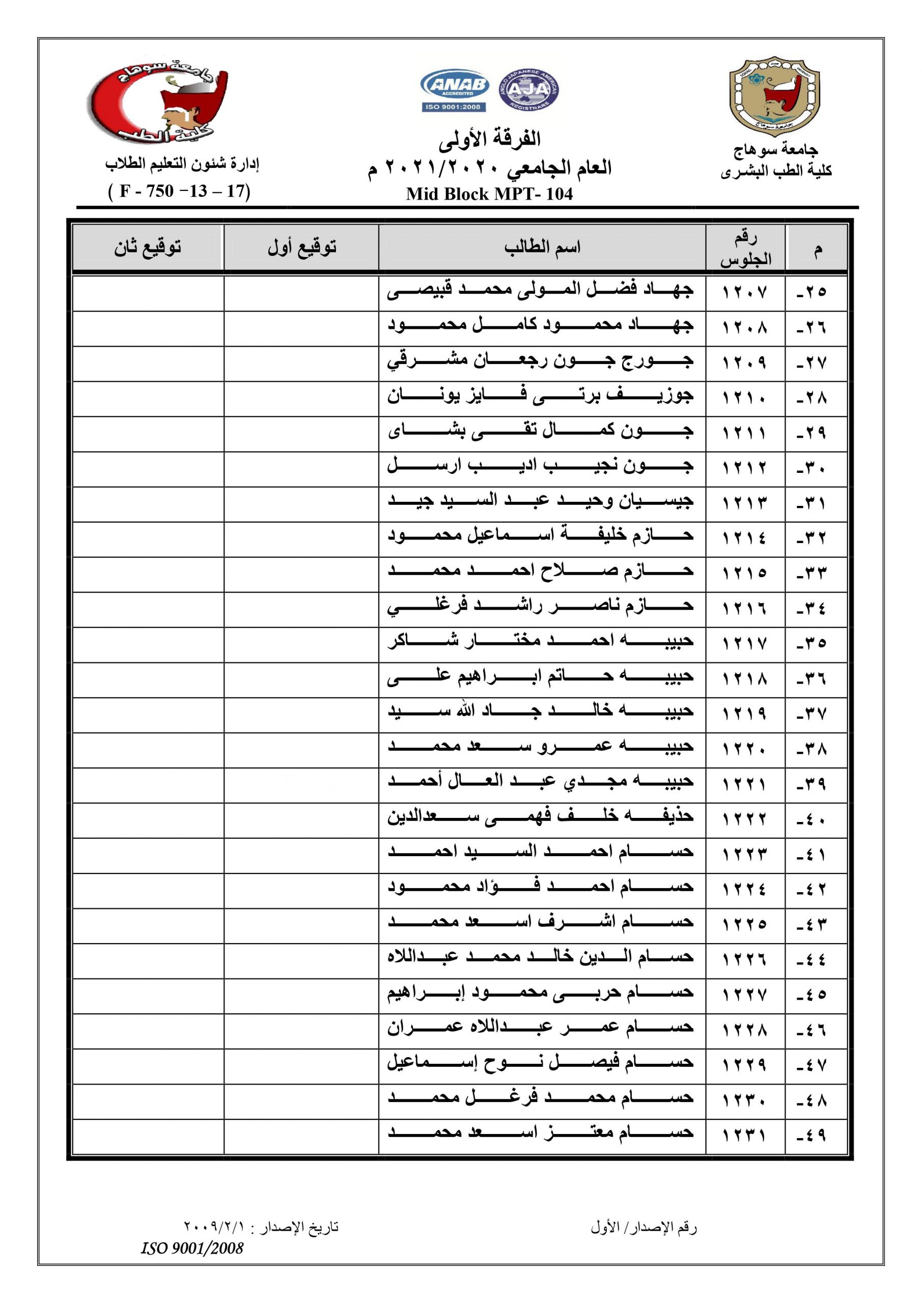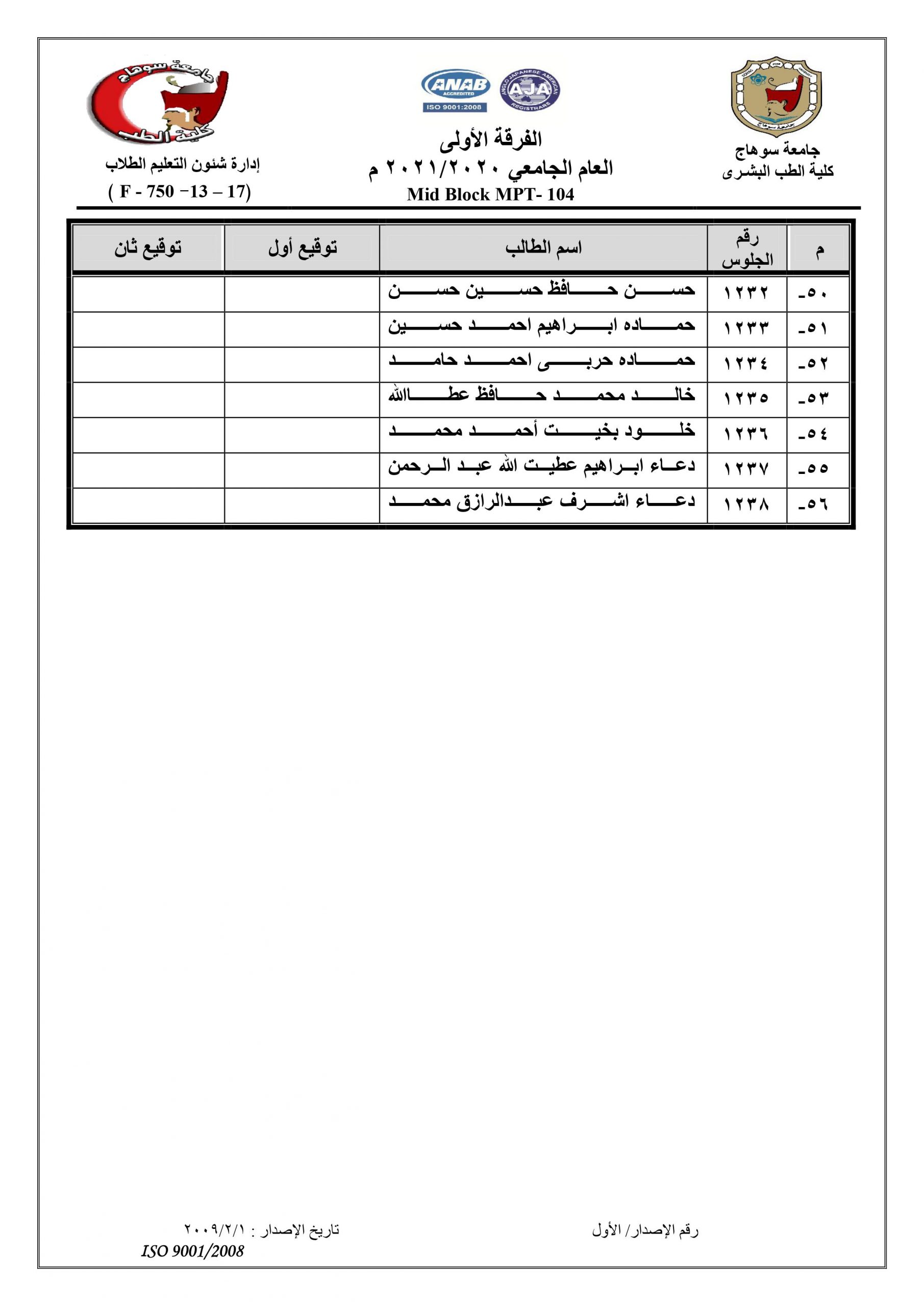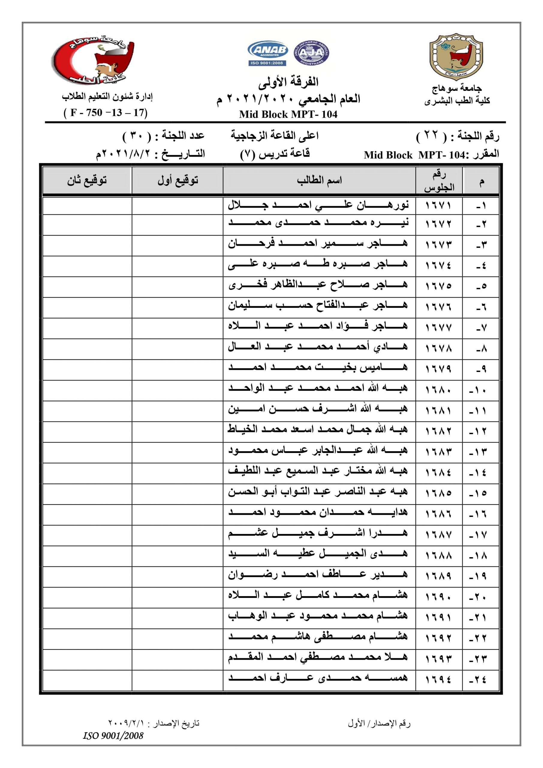 دليل امتحانات الفرقة الاولى العام الجامعي 2020/2021 م (عملي فارماكولوجي MPT)