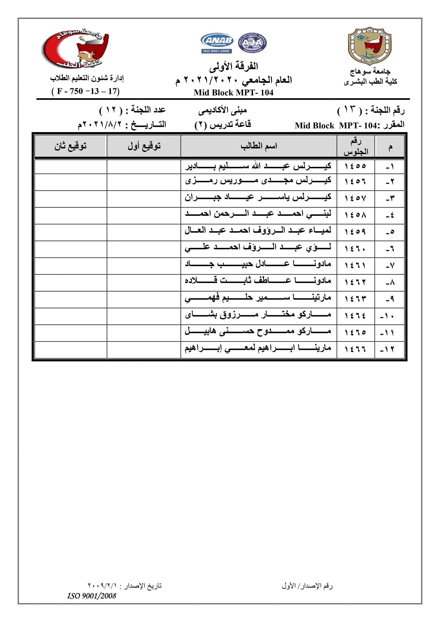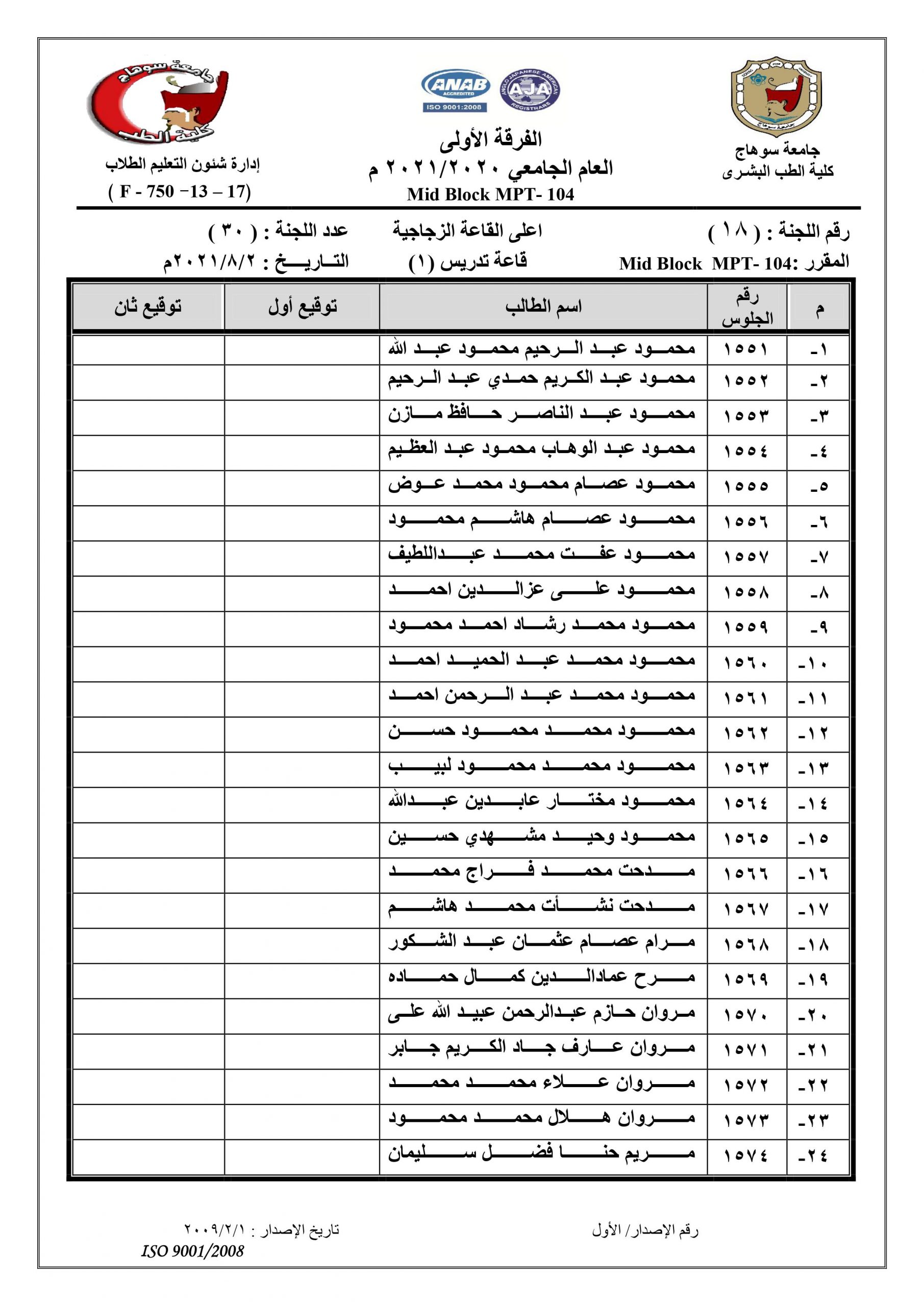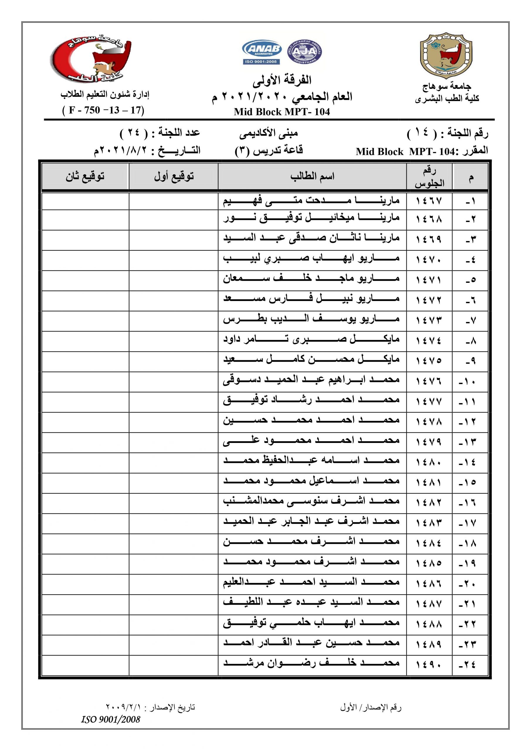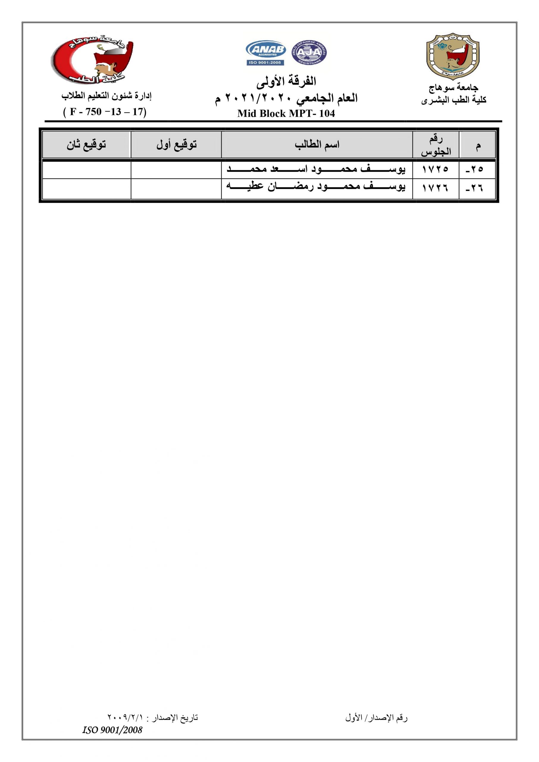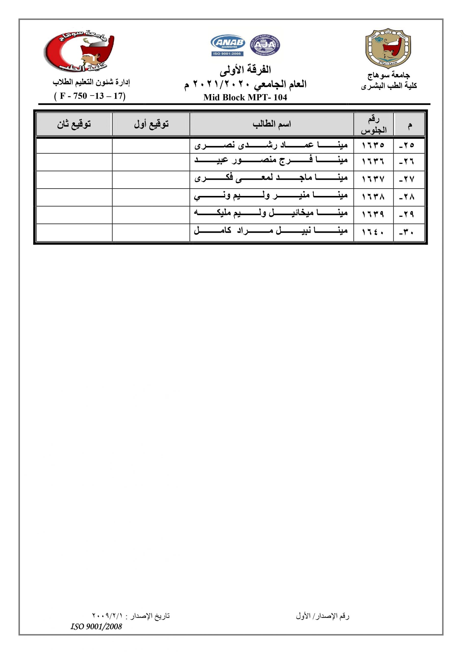 دليل امتحانات الفرقة الاولى العام الجامعي 2020/2021 م (عملي فارماكولوجي MPT)