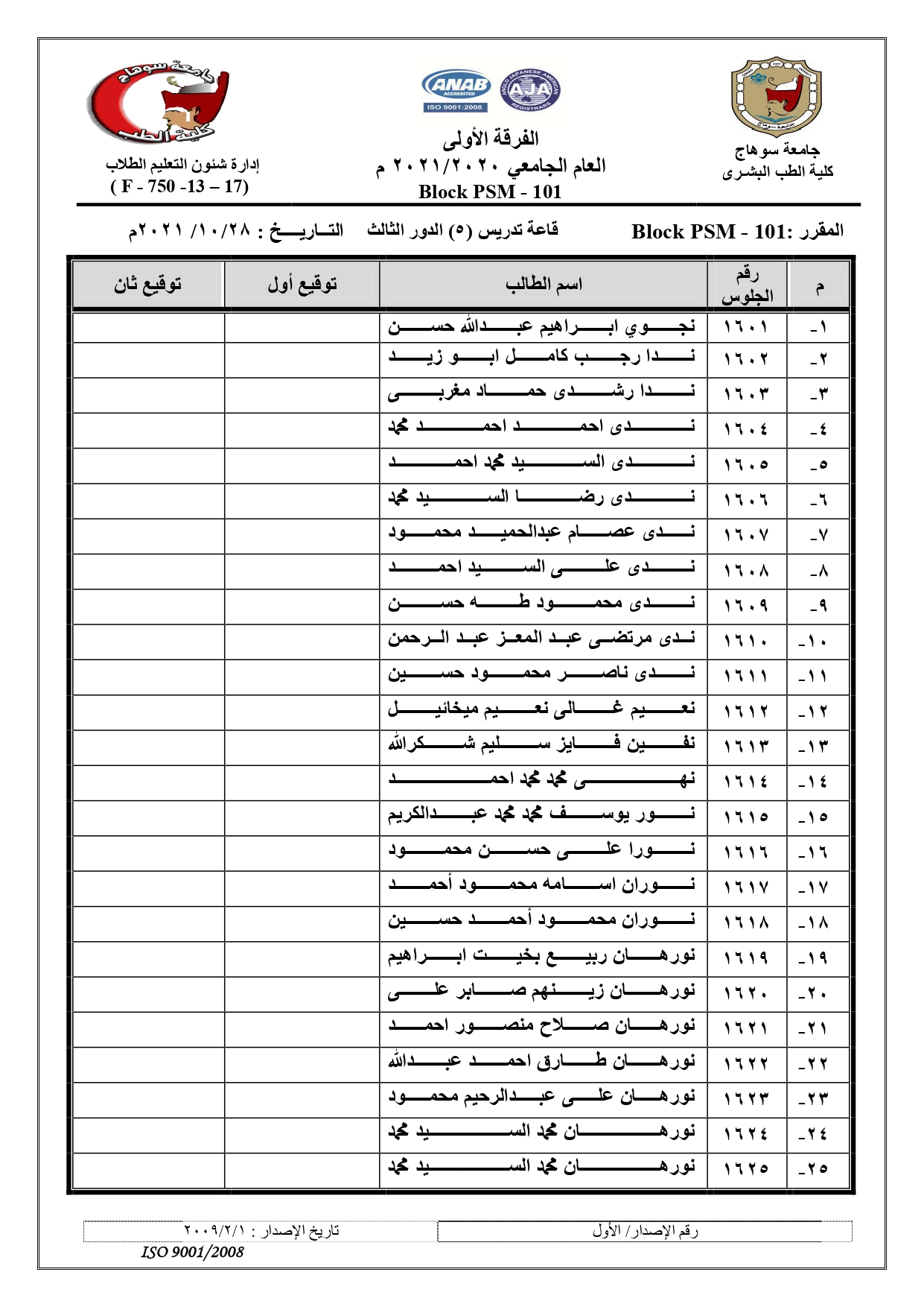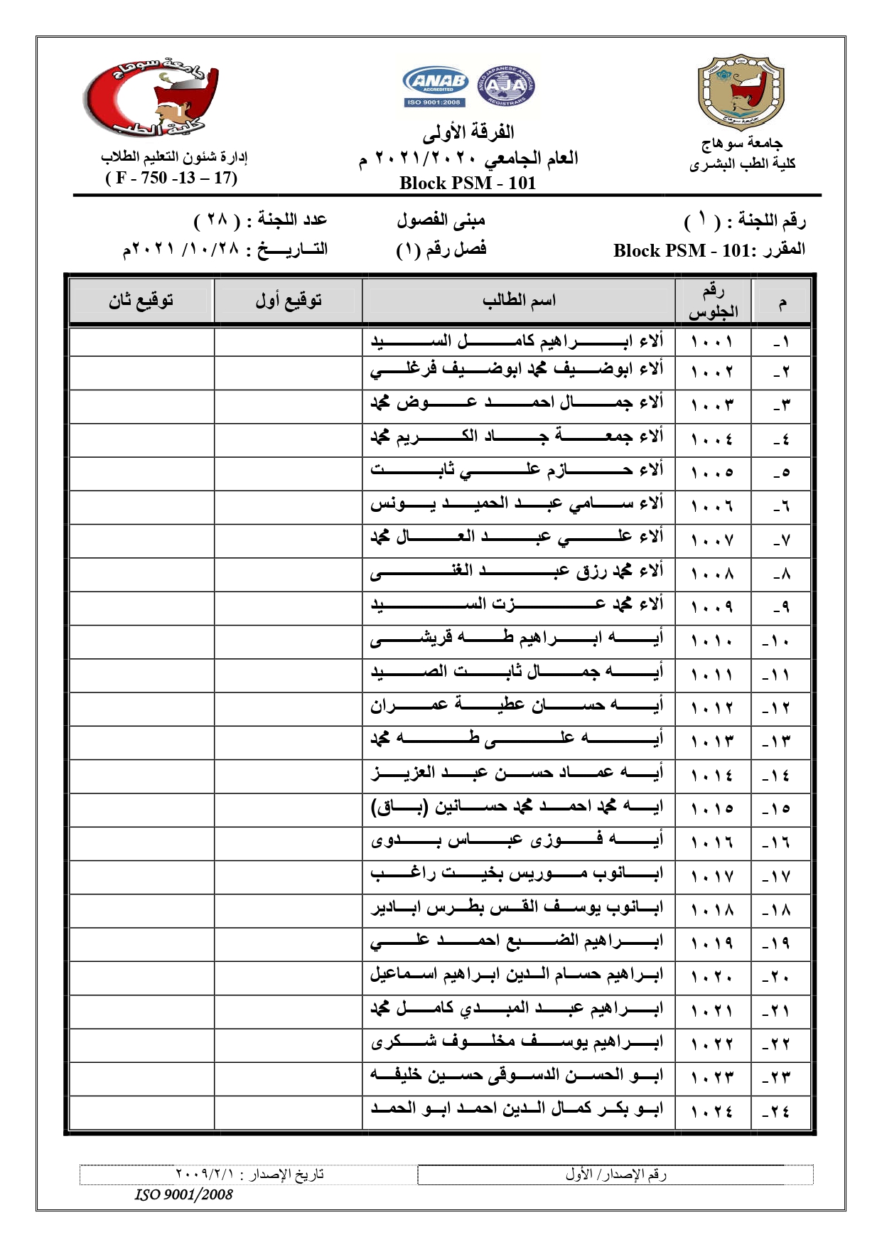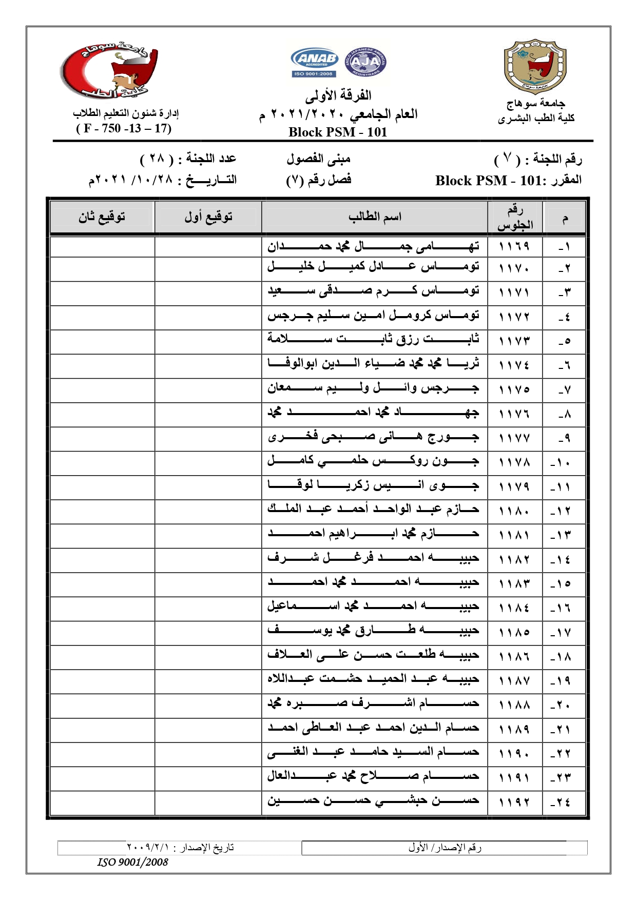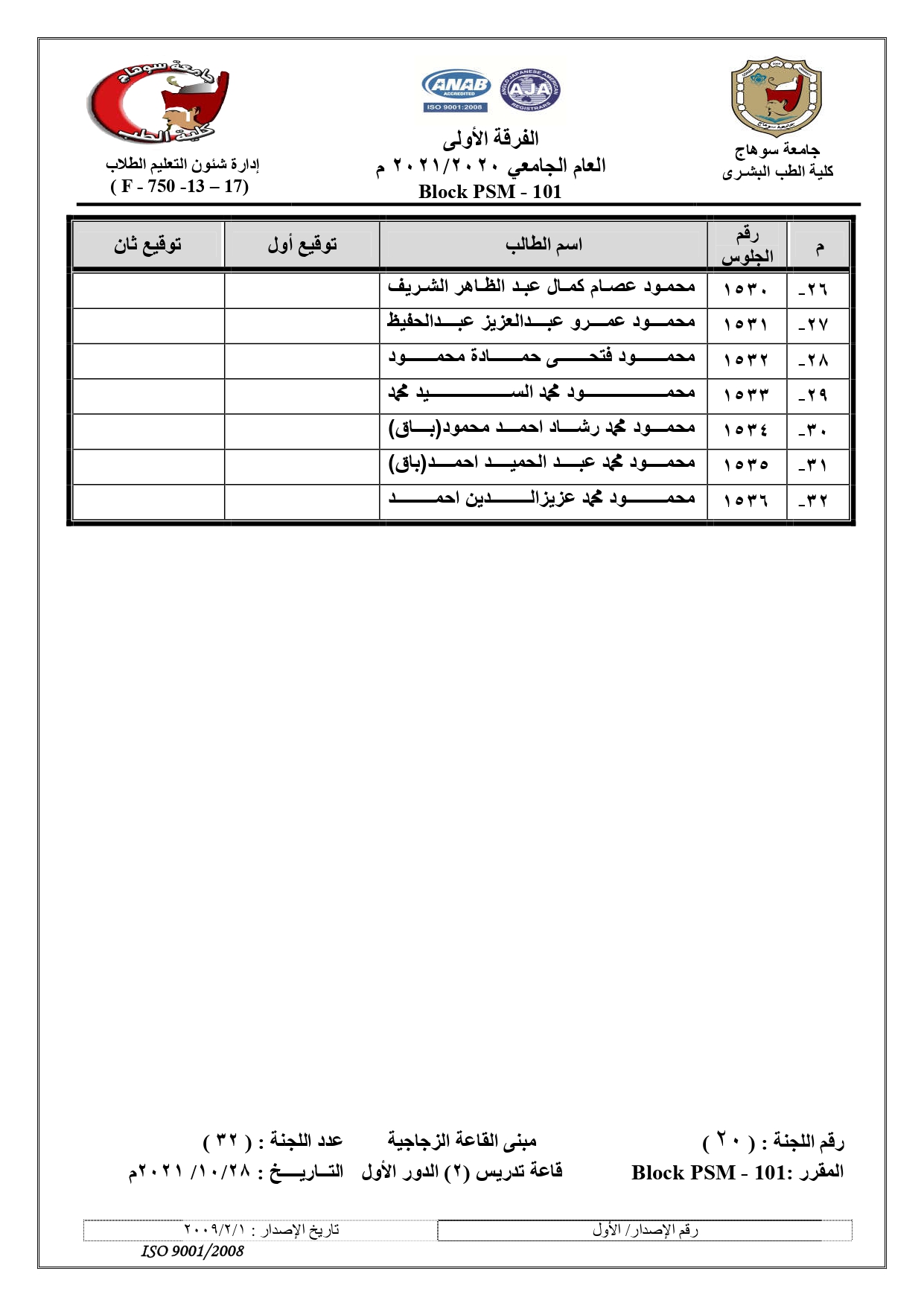 الرئيسية » Blog » دليل لجان وارقام جلوس الفرقة الاولى العام الجامعي 2022/2021 (Block PSM-101)دليل لجان وارقام جلوس الفرقة الاولى العام الجامعي 2022/2021 (Block PSM-101)by كلية الطب2021-10-142021-10-14