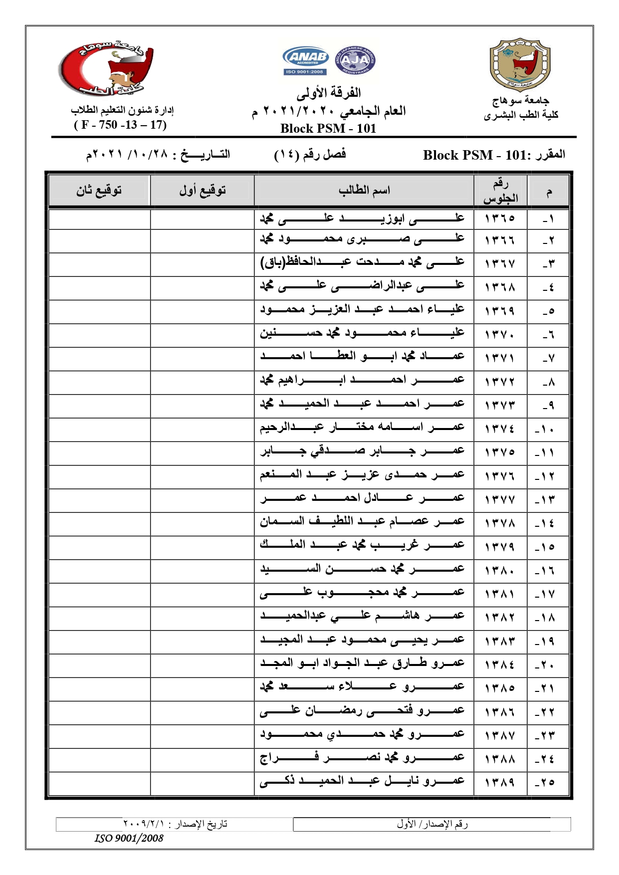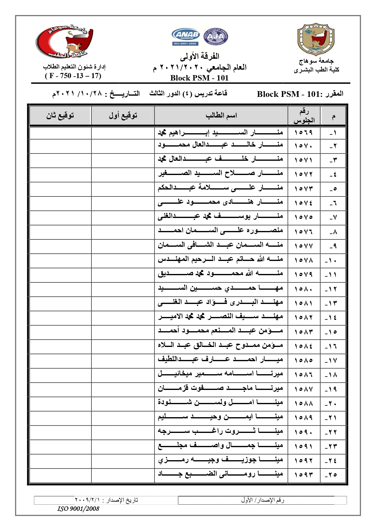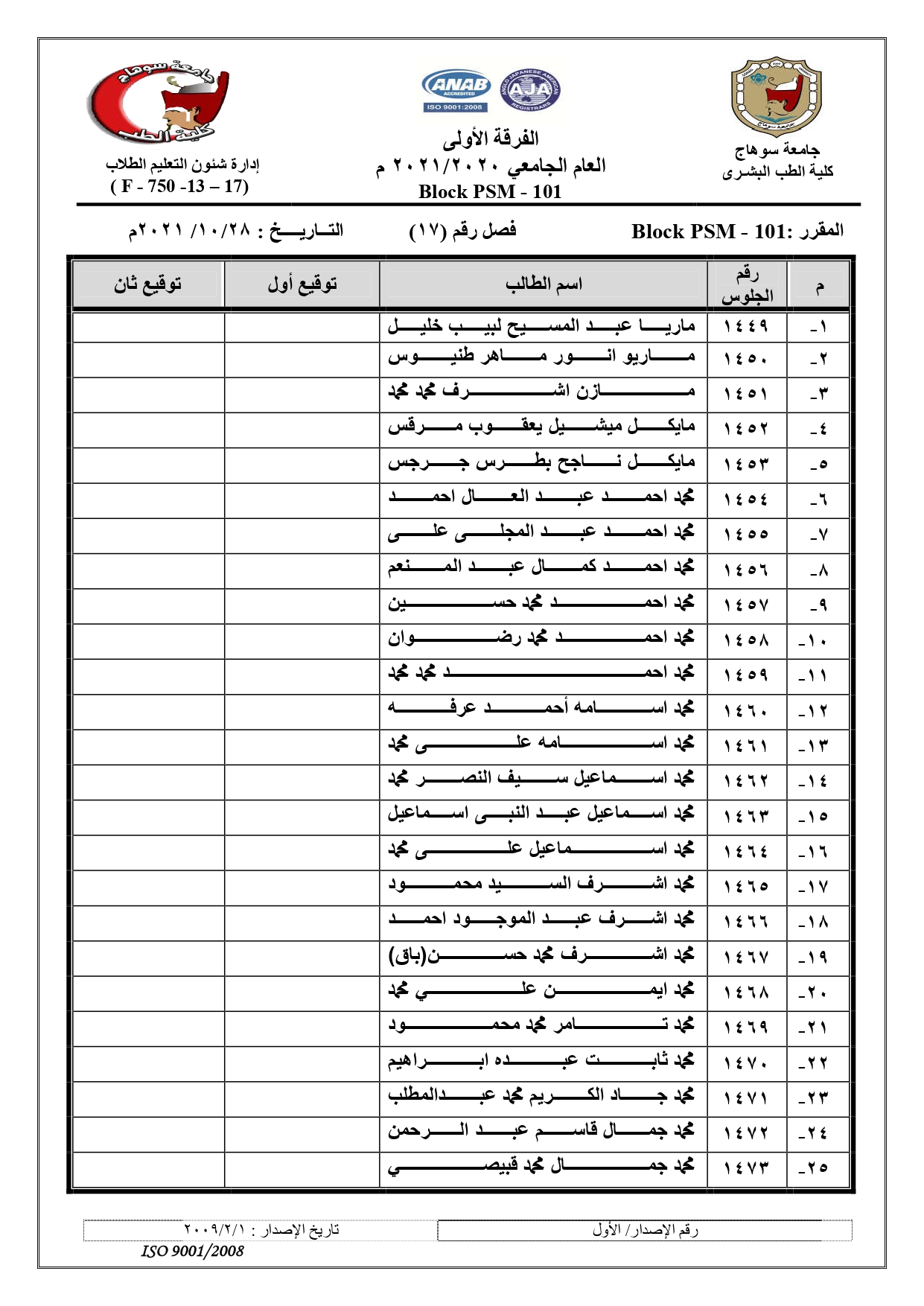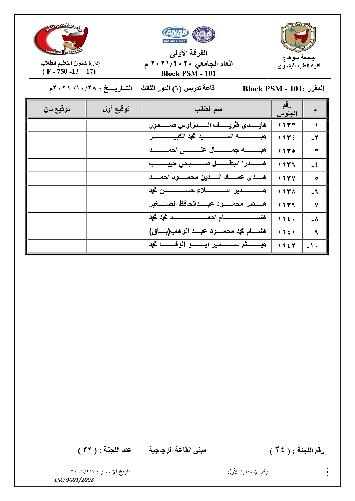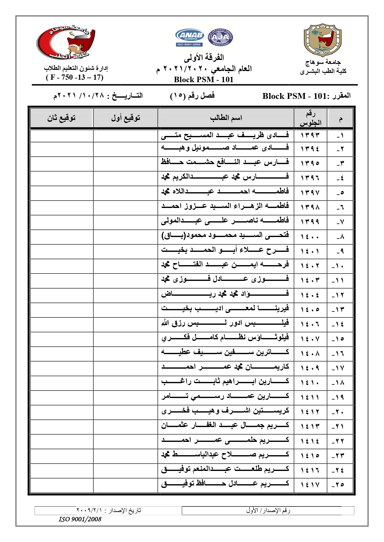الرئيسية » Blog » دليل لجان وارقام جلوس الفرقة الاولى العام الجامعي 2022/2021 (Block PSM-101)دليل لجان وارقام جلوس الفرقة الاولى العام الجامعي 2022/2021 (Block PSM-101)by كلية الطب2021-10-142021-10-14