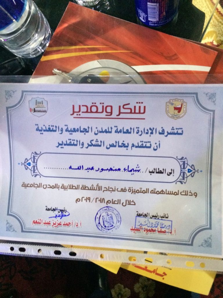 كرم اد/ احمد عزيز عبد المنعم فريق كورال الجامعة وذلك ضمن مهرجان ختام أنشطة المدن الجامعية