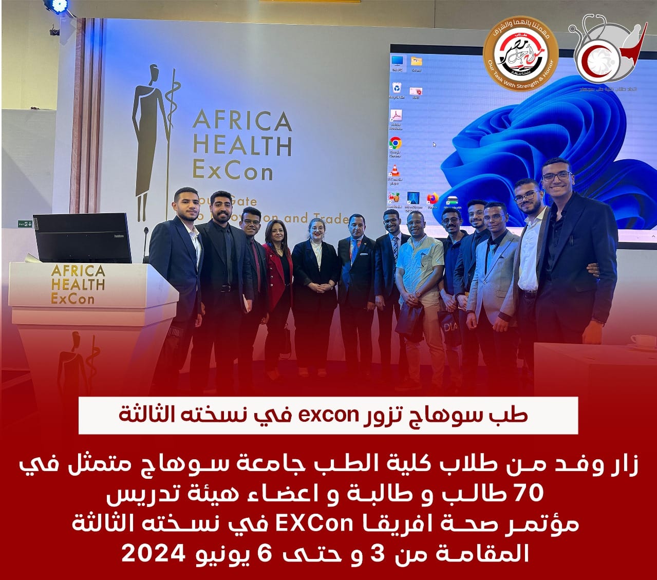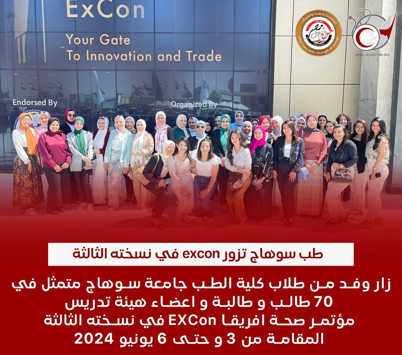 تحت رعاية السيد الاستاذ الدكتور حسان النعماني رئيس الجامعة و السيد الاستاذ الدكتور مجدي القاضي عميد كلية الطب البشري زار وفد من طلاب كلية الطب جامعة سوهاج متمثل في 70 طالب و طالبة و اعضاء هيئة تدريس مؤتمر صحة افريقا EXCon في نسخته الثالثة المقامة من 3 و حتى 6 يونيو 2024