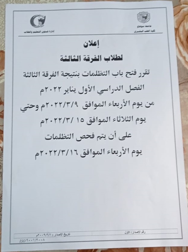 فتح باب التظلمات بنتيجة الفرقة الثالثة الفصل الدراسي الاول يناير 2022