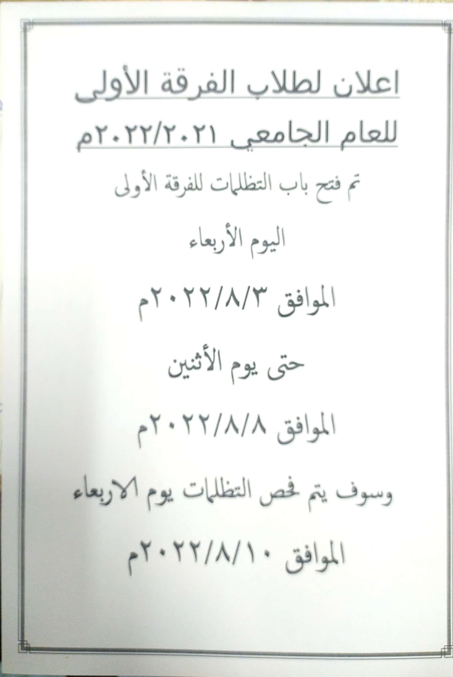 فتح باب التظلمات على نتيجة الفرقة الاولى الفصل الدراسي الثاني