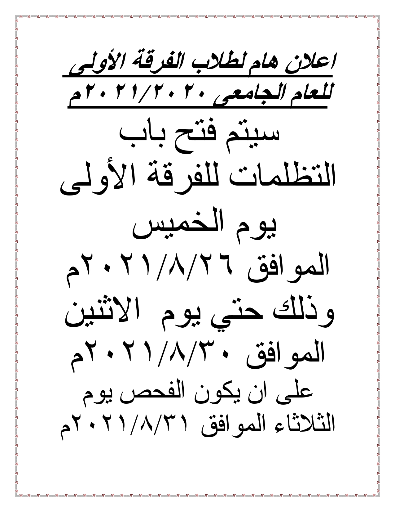 فتح باب التظلمات للفرقة الاولى العام الجامعي 2020/2021