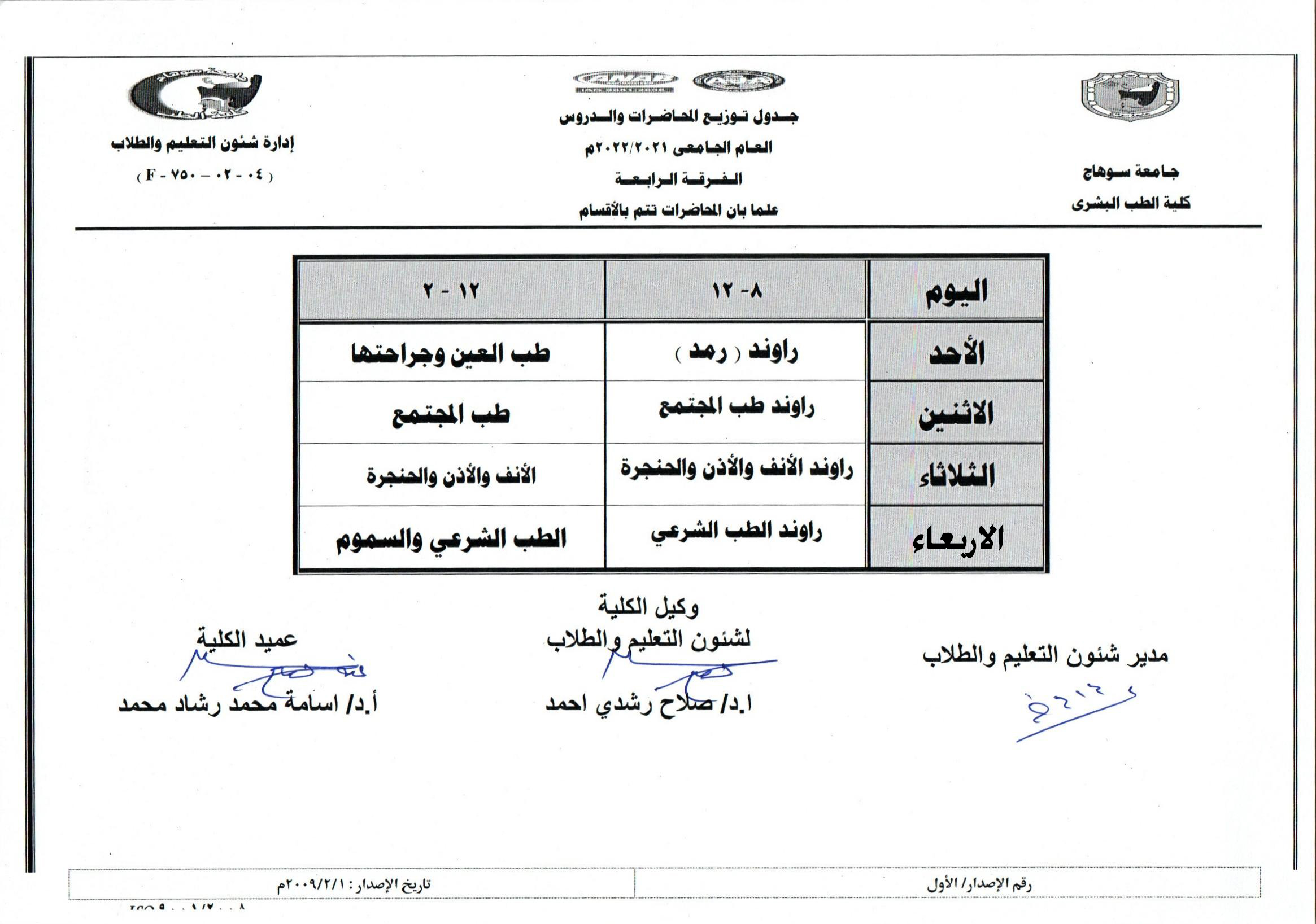 قائمة بأسماء طلاب الفرقة الرابعة (لائحة قديمة) والجدول الدراسي الخاص بالائحة القديمة