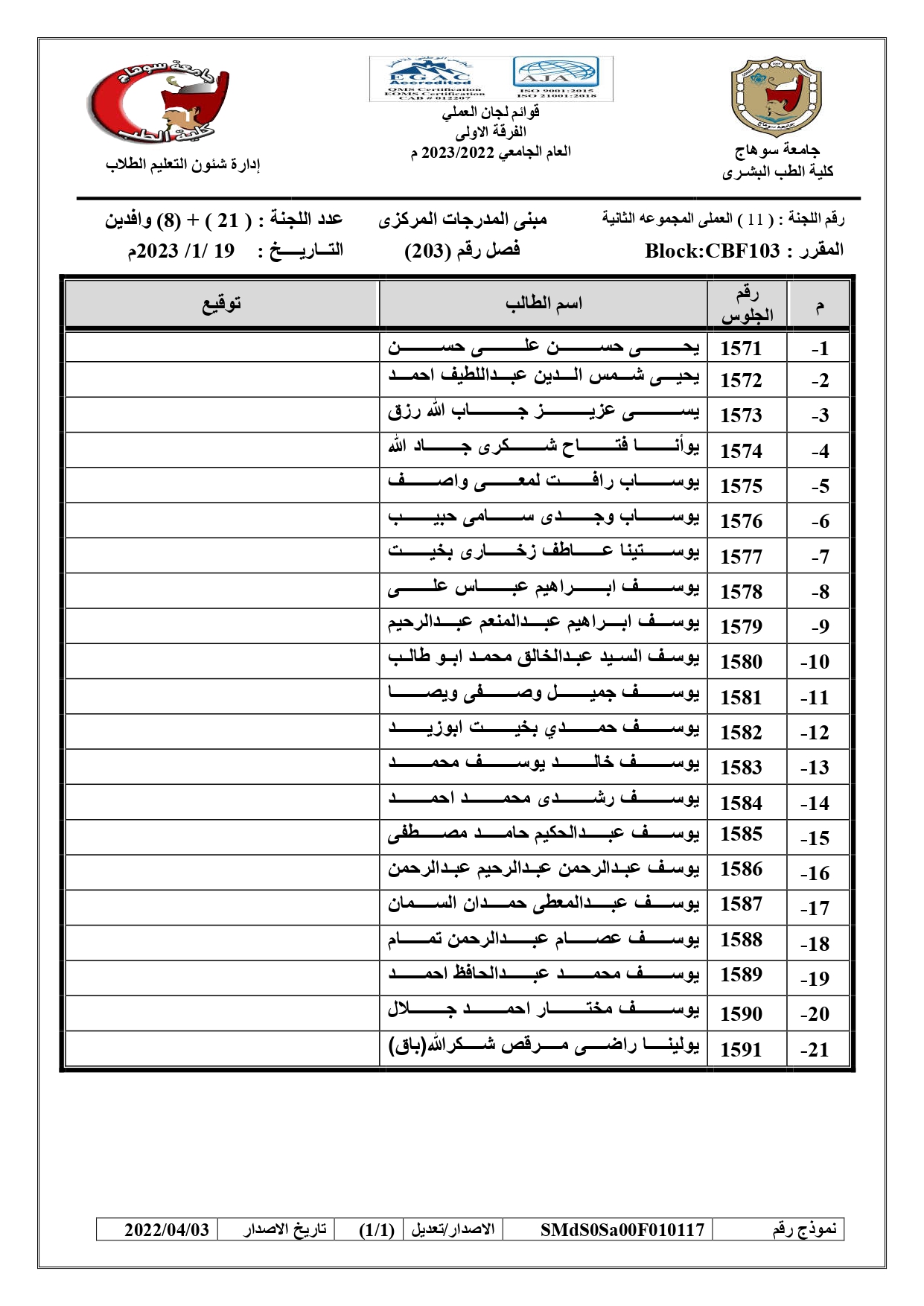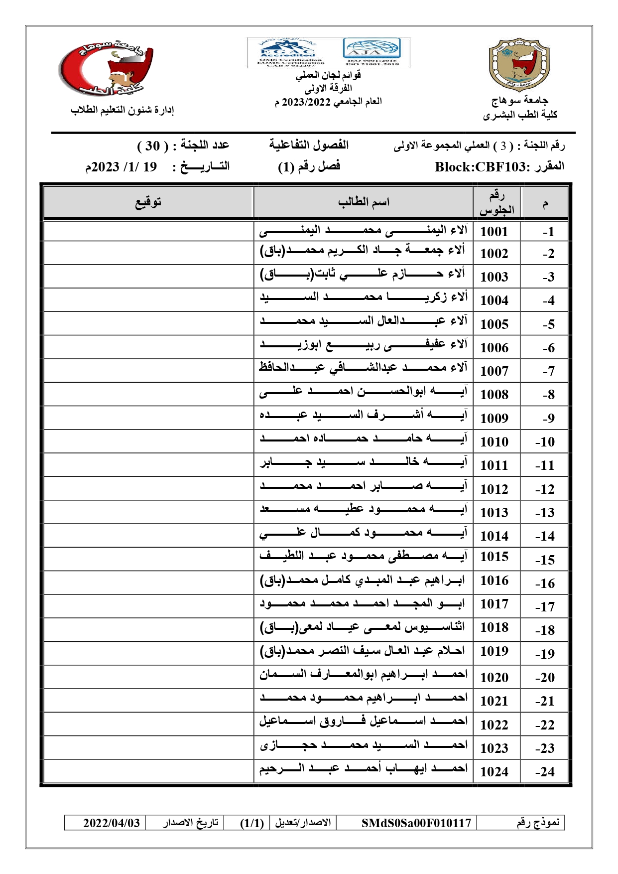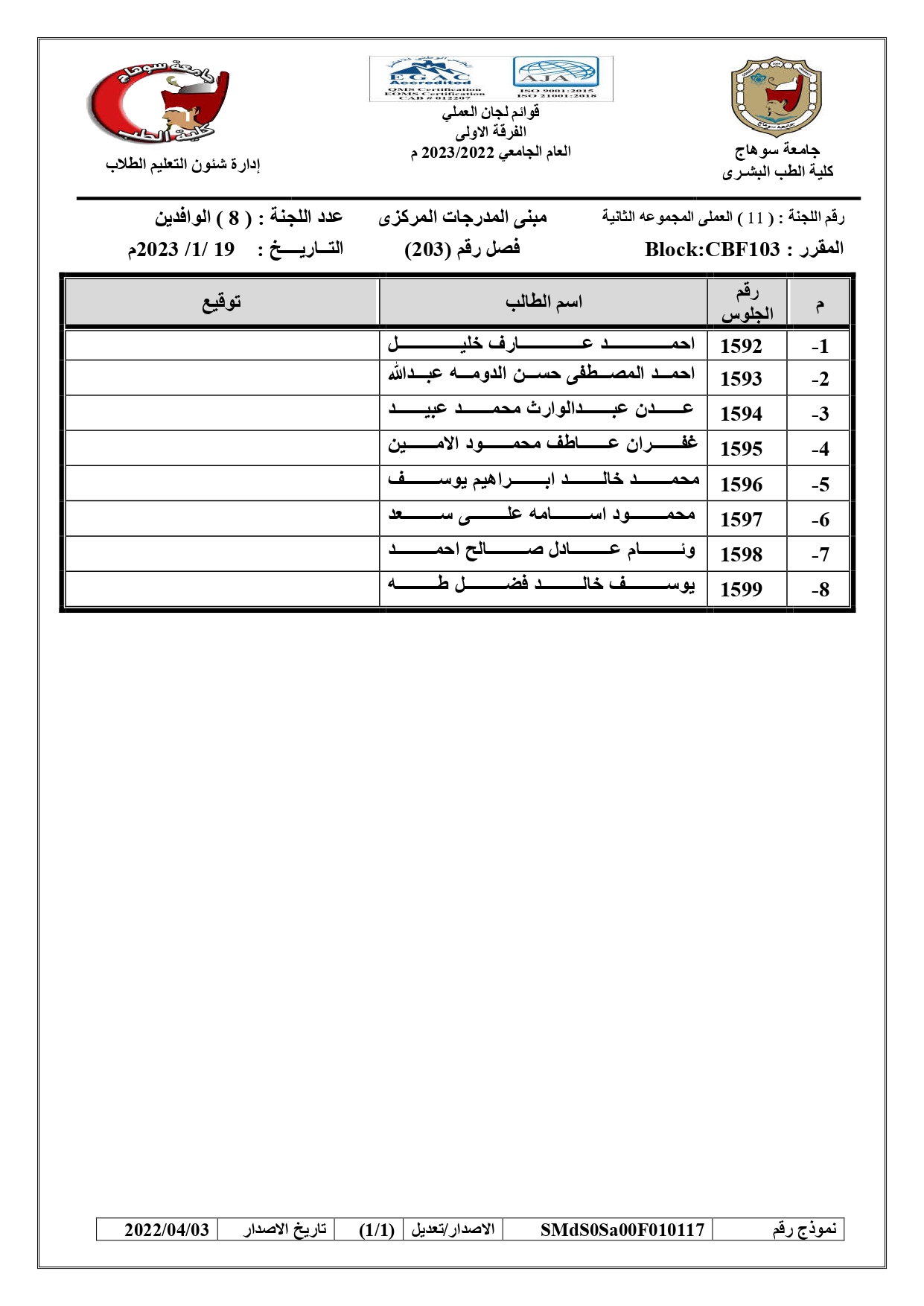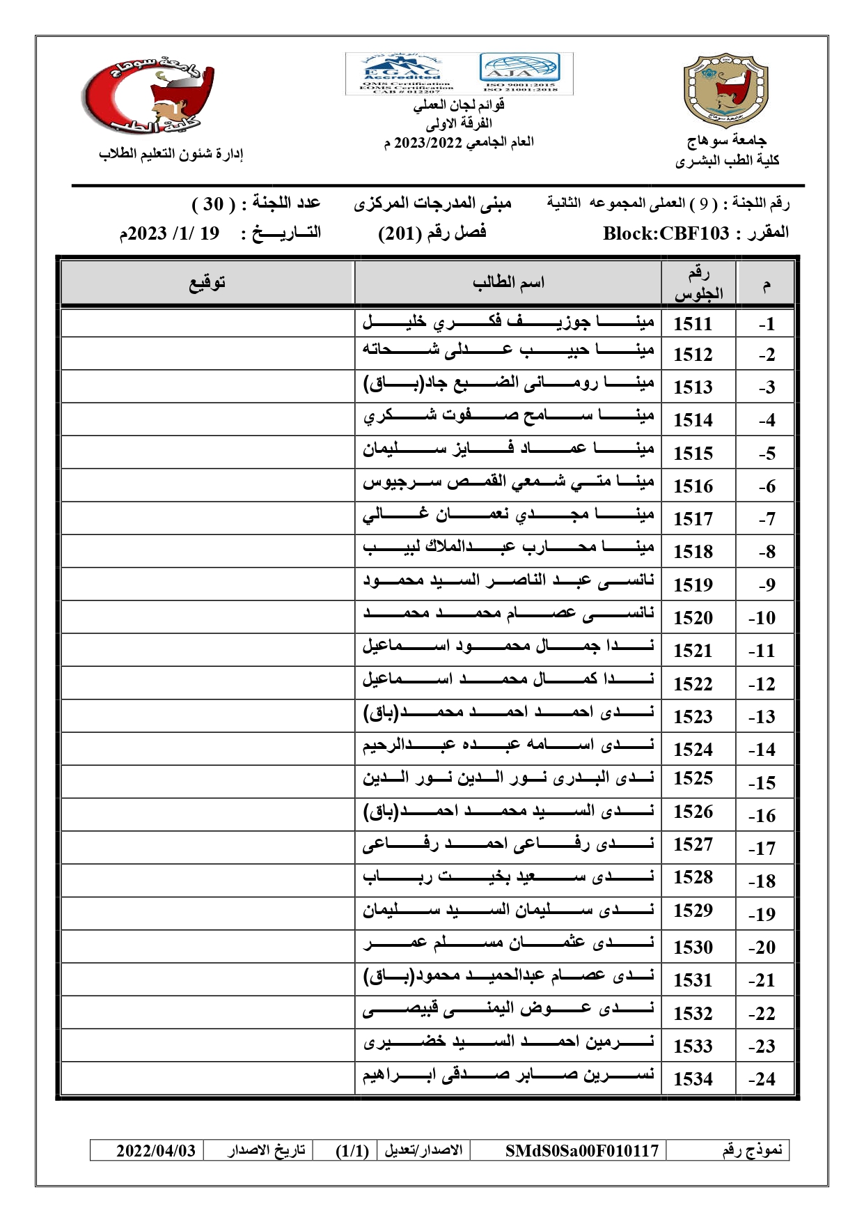 قوائم لجان امتحانات العملي الفرقة الاولى Block CBF 103