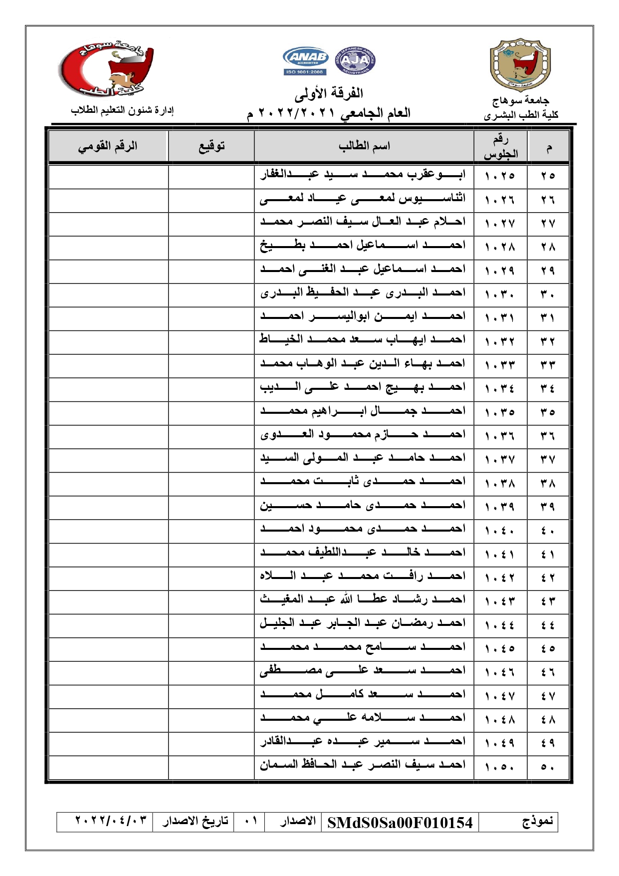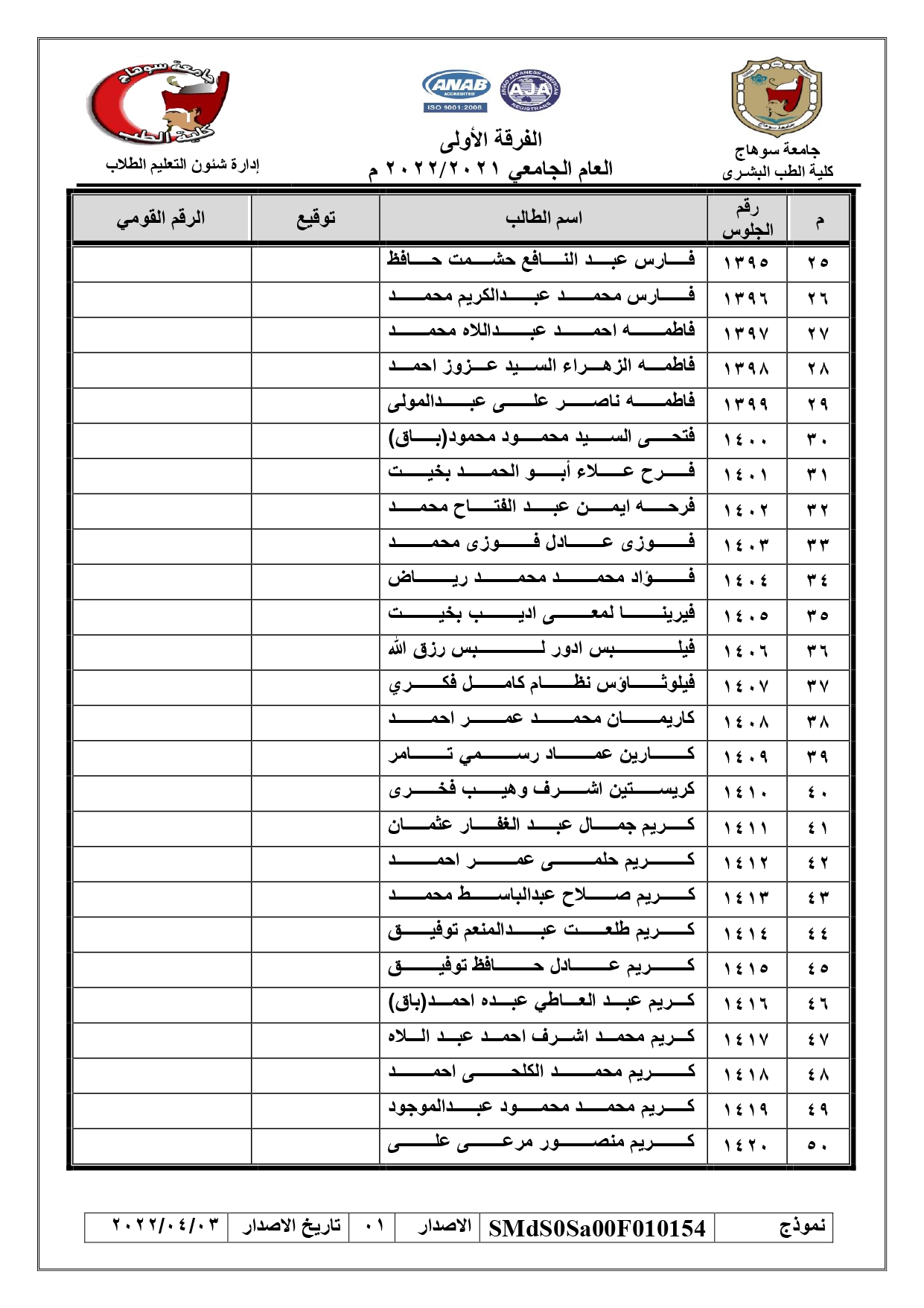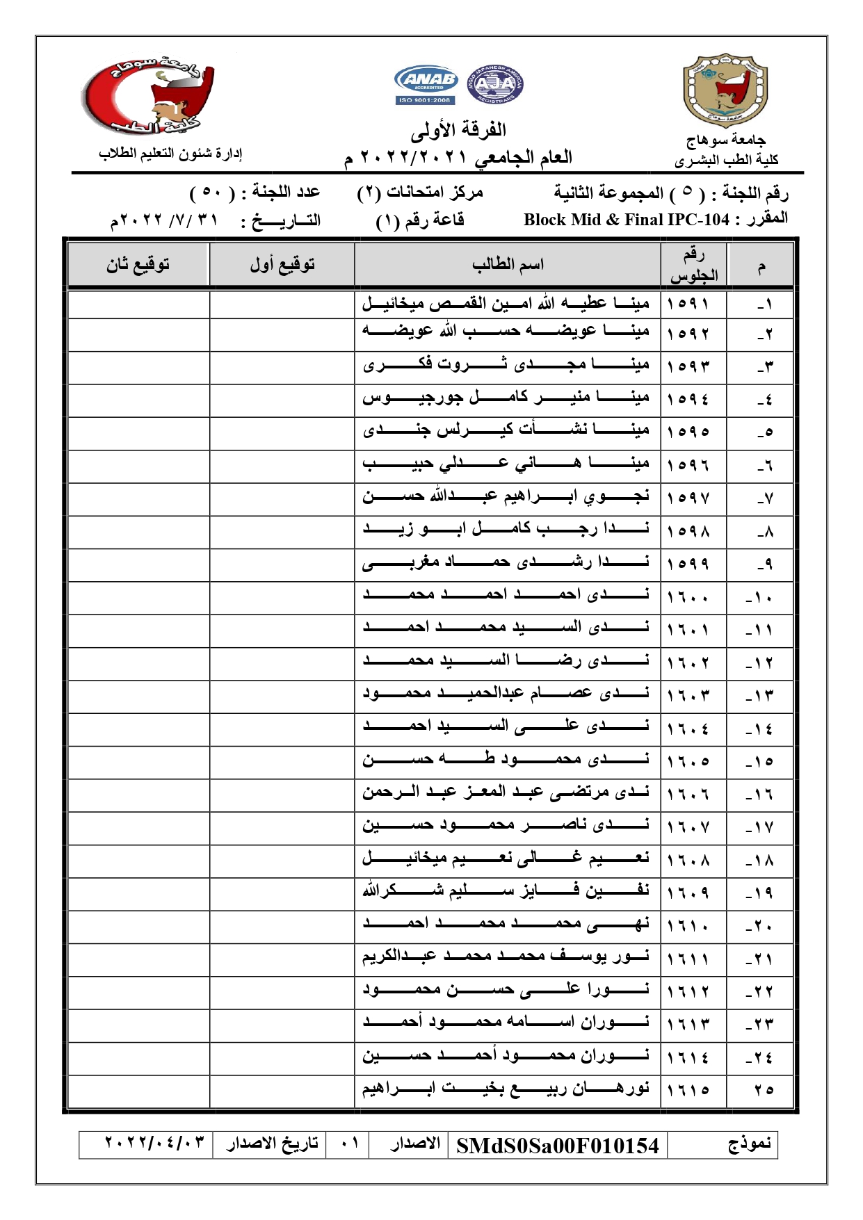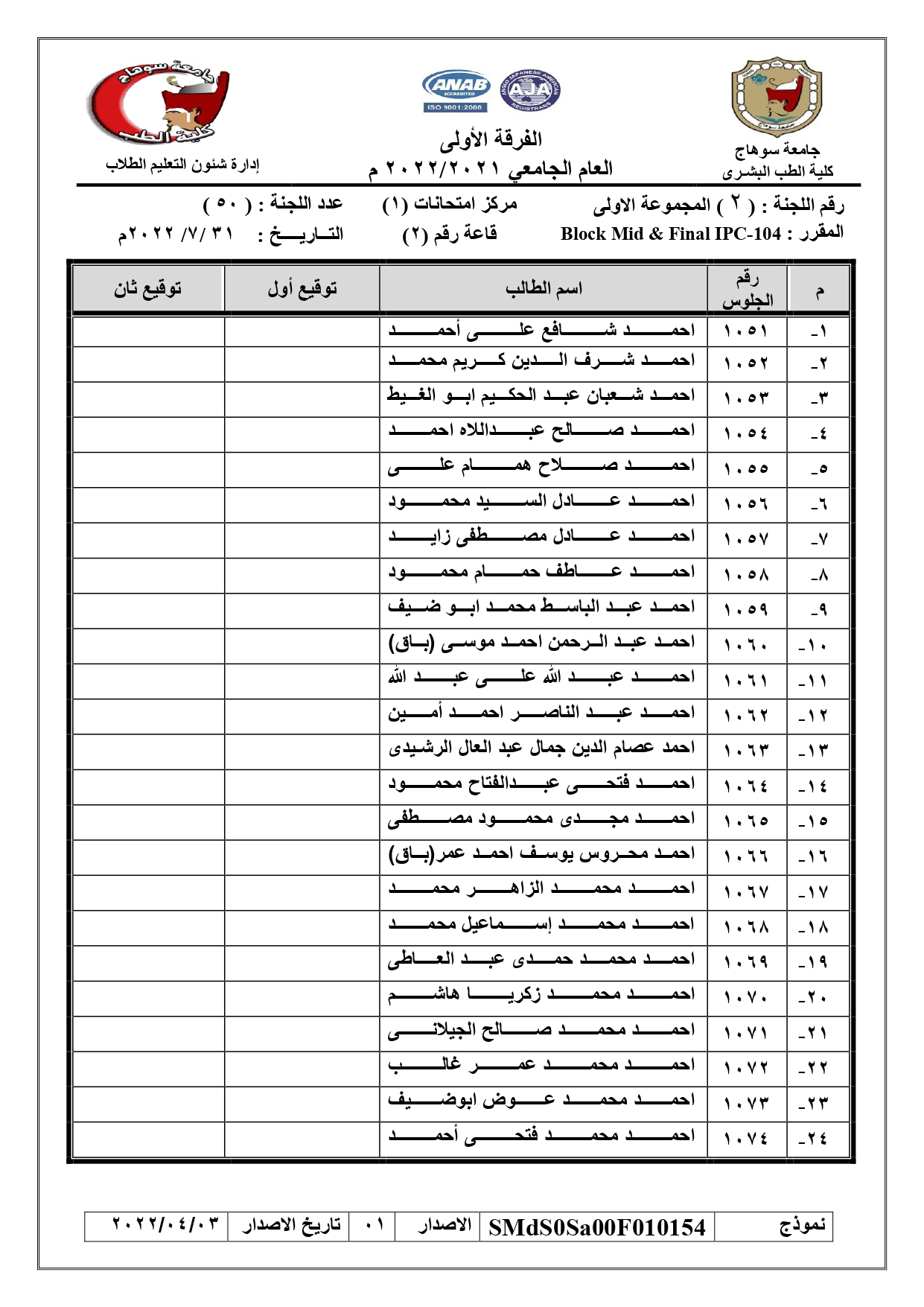 الرئيسية » Blog » قوائم لجان امتحانات الفرقة الاولى امتحان (BLOCK IPC-104) العام الجامعي 2021/2022قوائم لجان امتحانات الفرقة الاولى امتحان (BLOCK IPC-104) العام الجامعي 2021/2022by كلية الطب2022-07-31