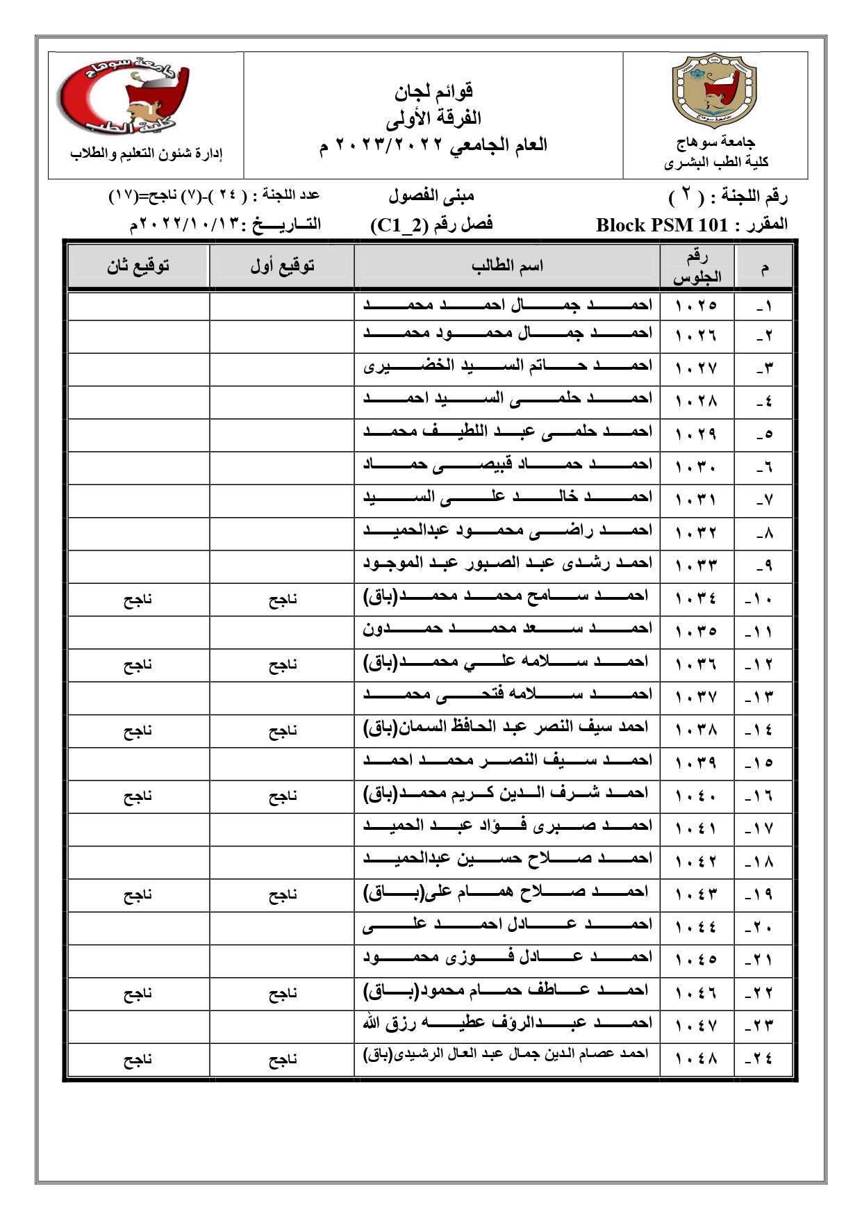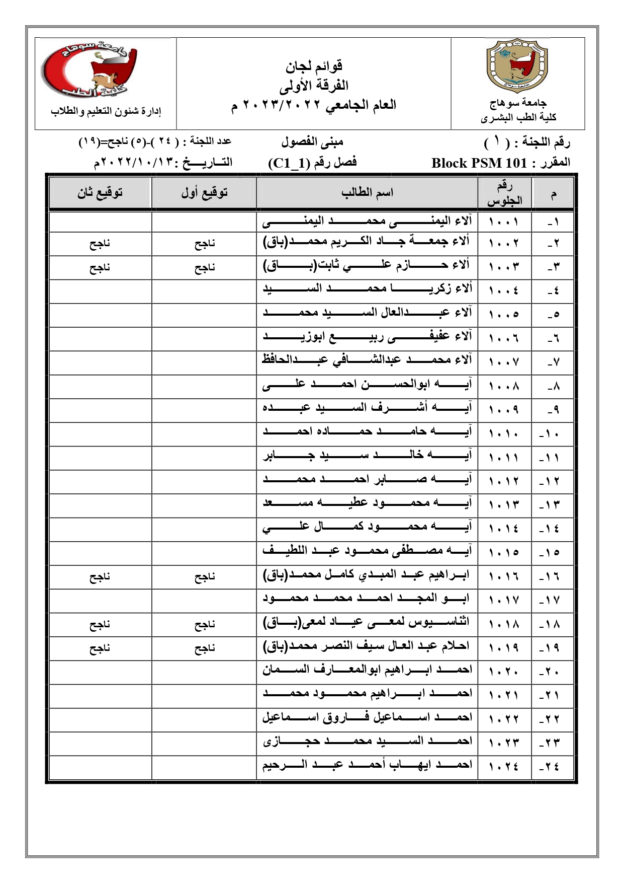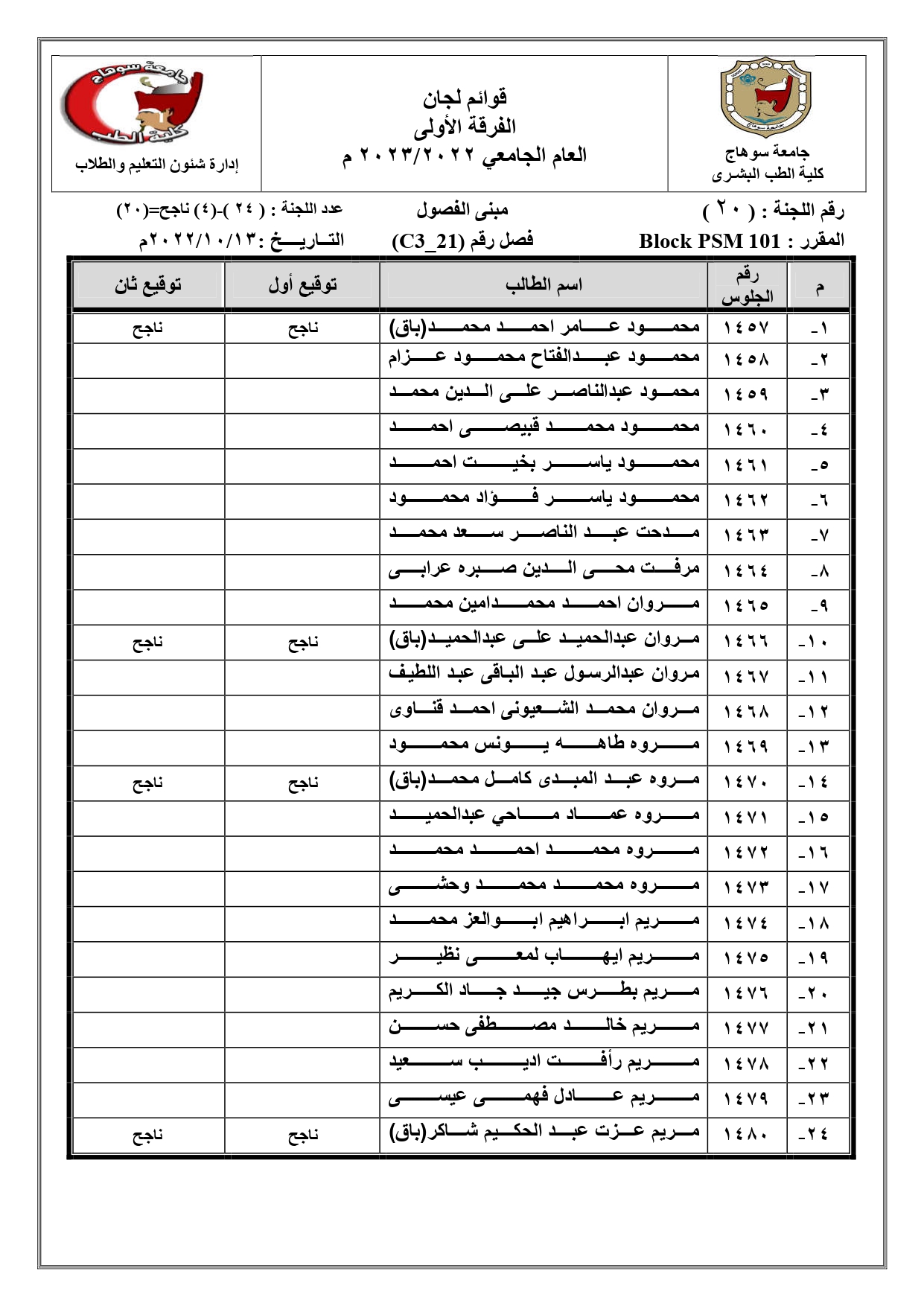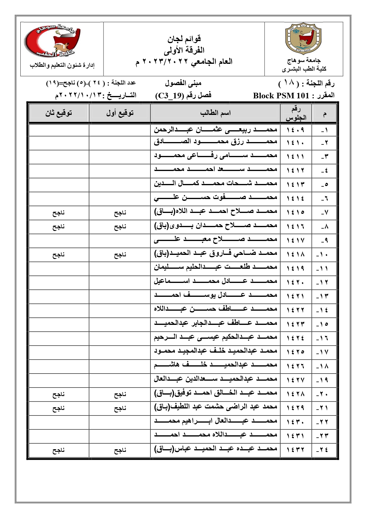 الرئيسية » Blog » قوائم لجان امتحانات الفرقة الاولى Block PSM-101 الدور الاول الفصل الدراسي الاول العام الجامعي 2022/2023قوائم لجان امتحانات الفرقة الاولى Block PSM-101 الدور الاول الفصل الدراسي الاول العام الجامعي 2022/2023by كلية الطب2022-10-102022-10-11