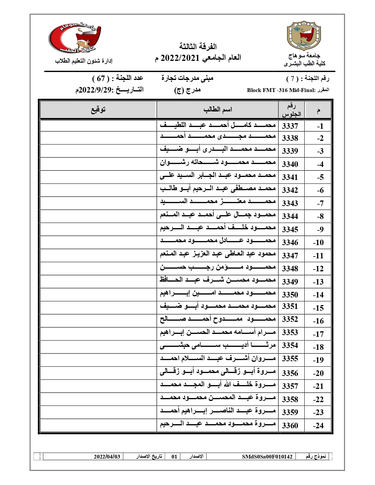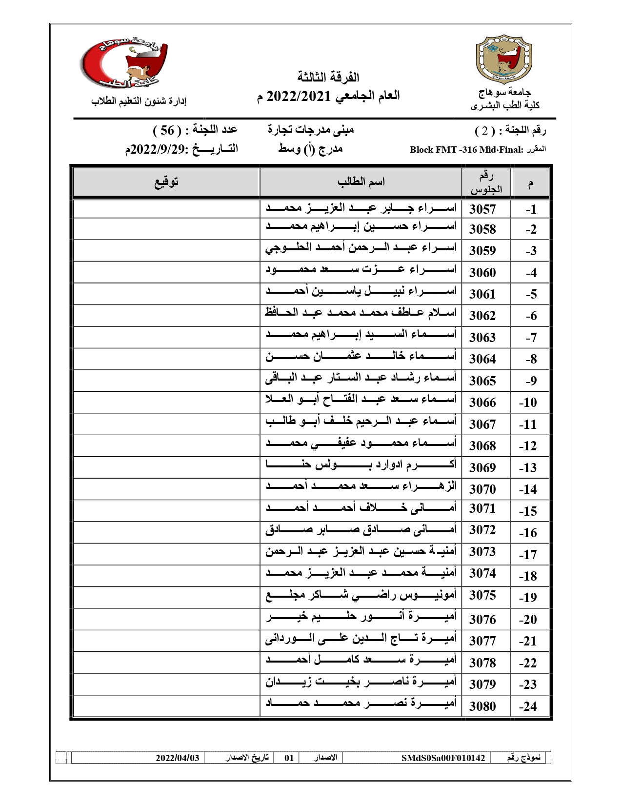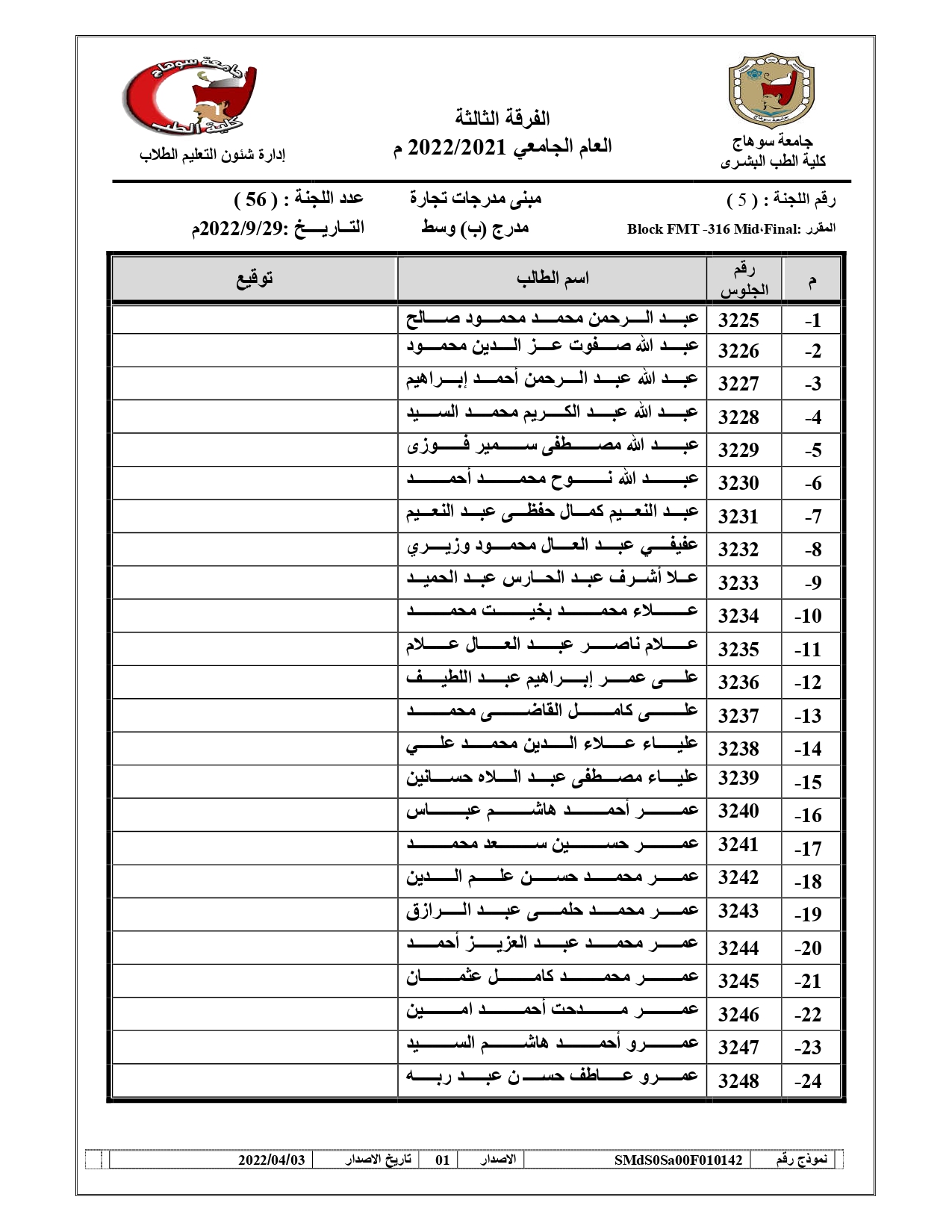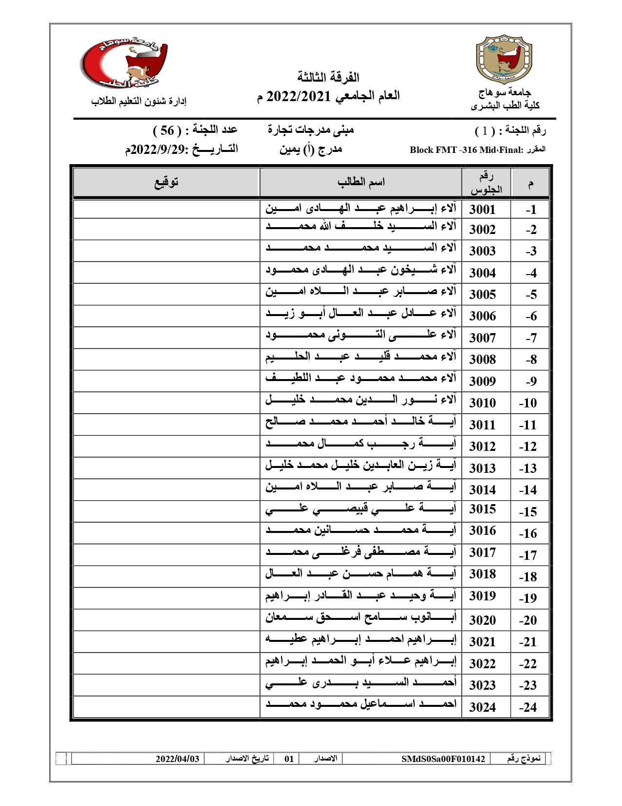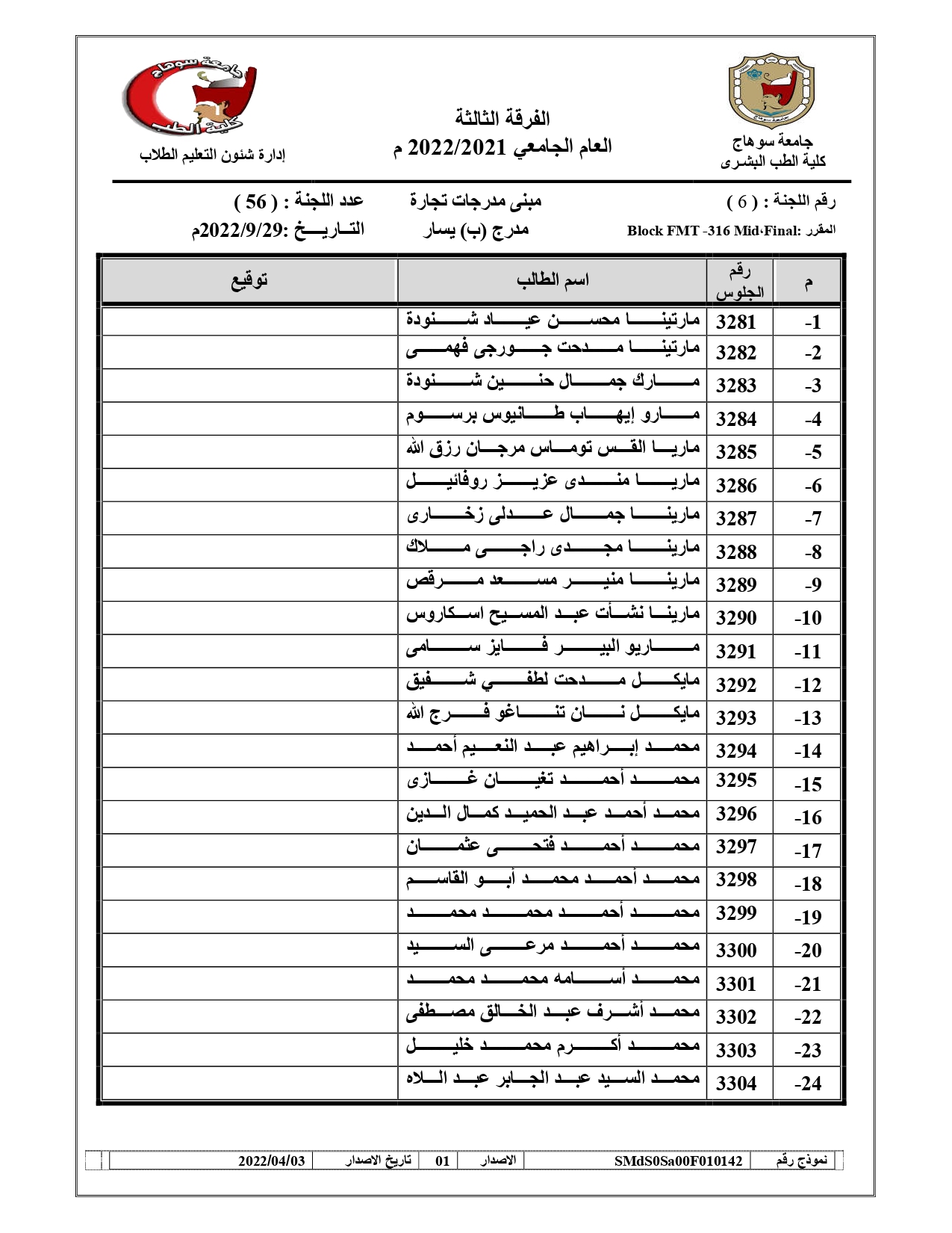 قوائم لجان امتحانات الفرقة الثالثة BLOCK FMT-316