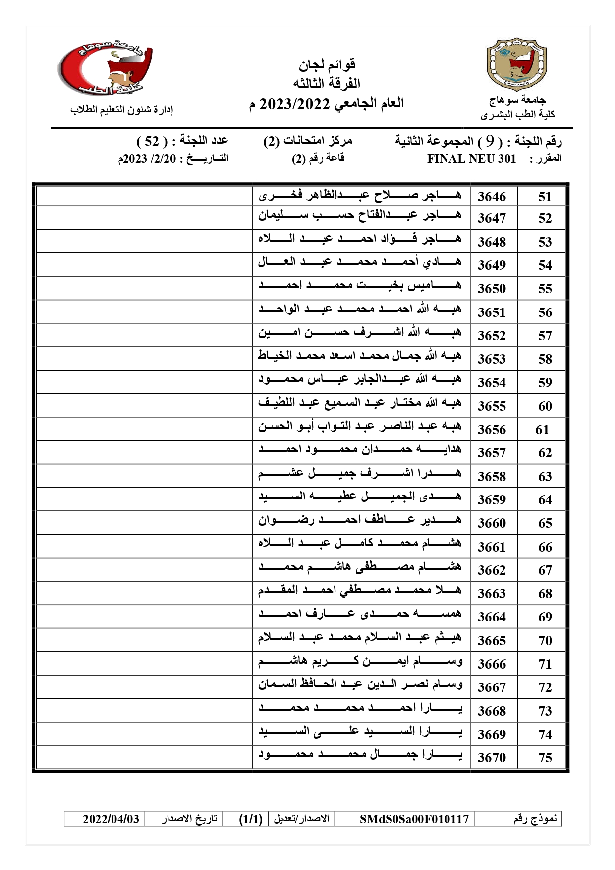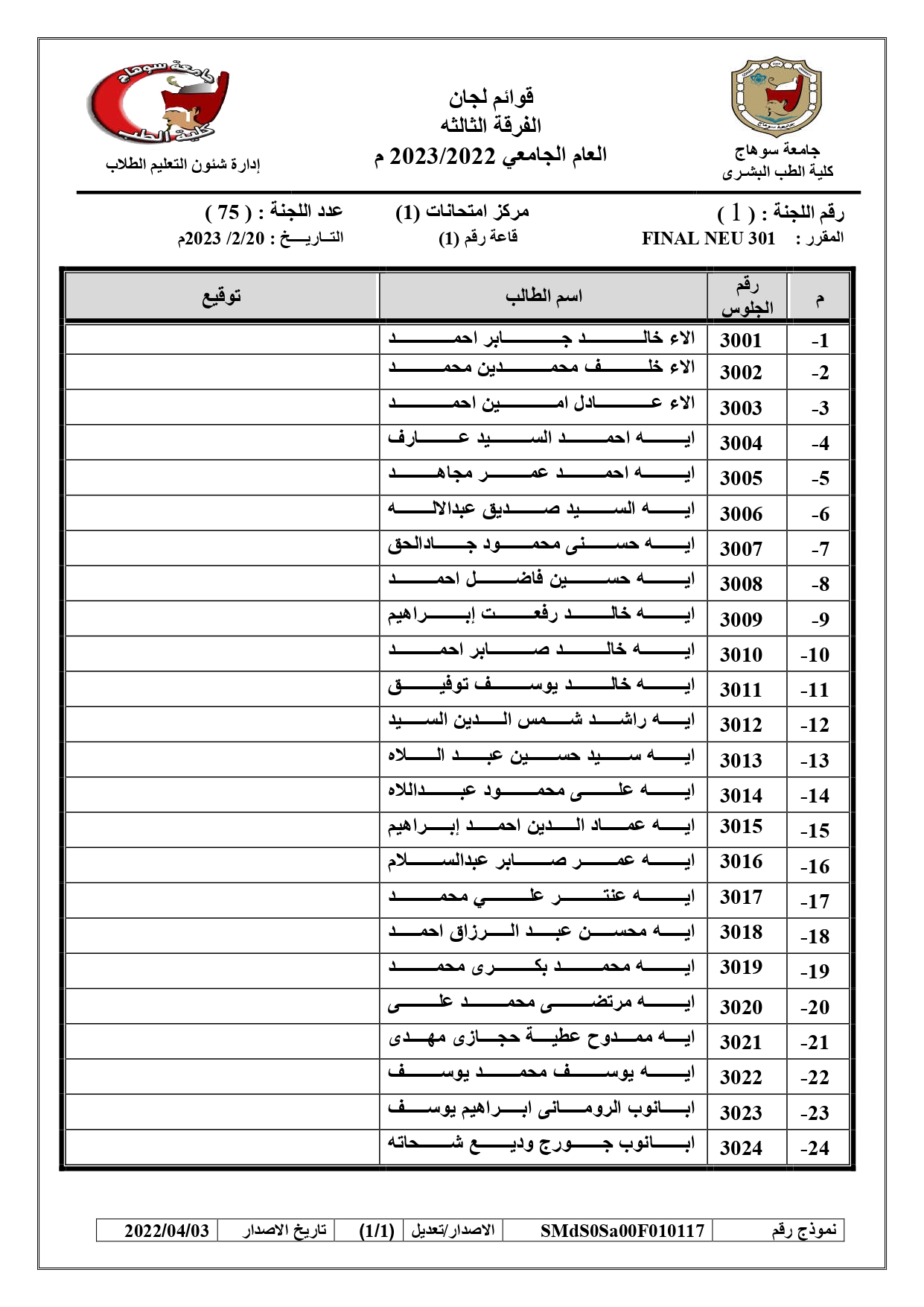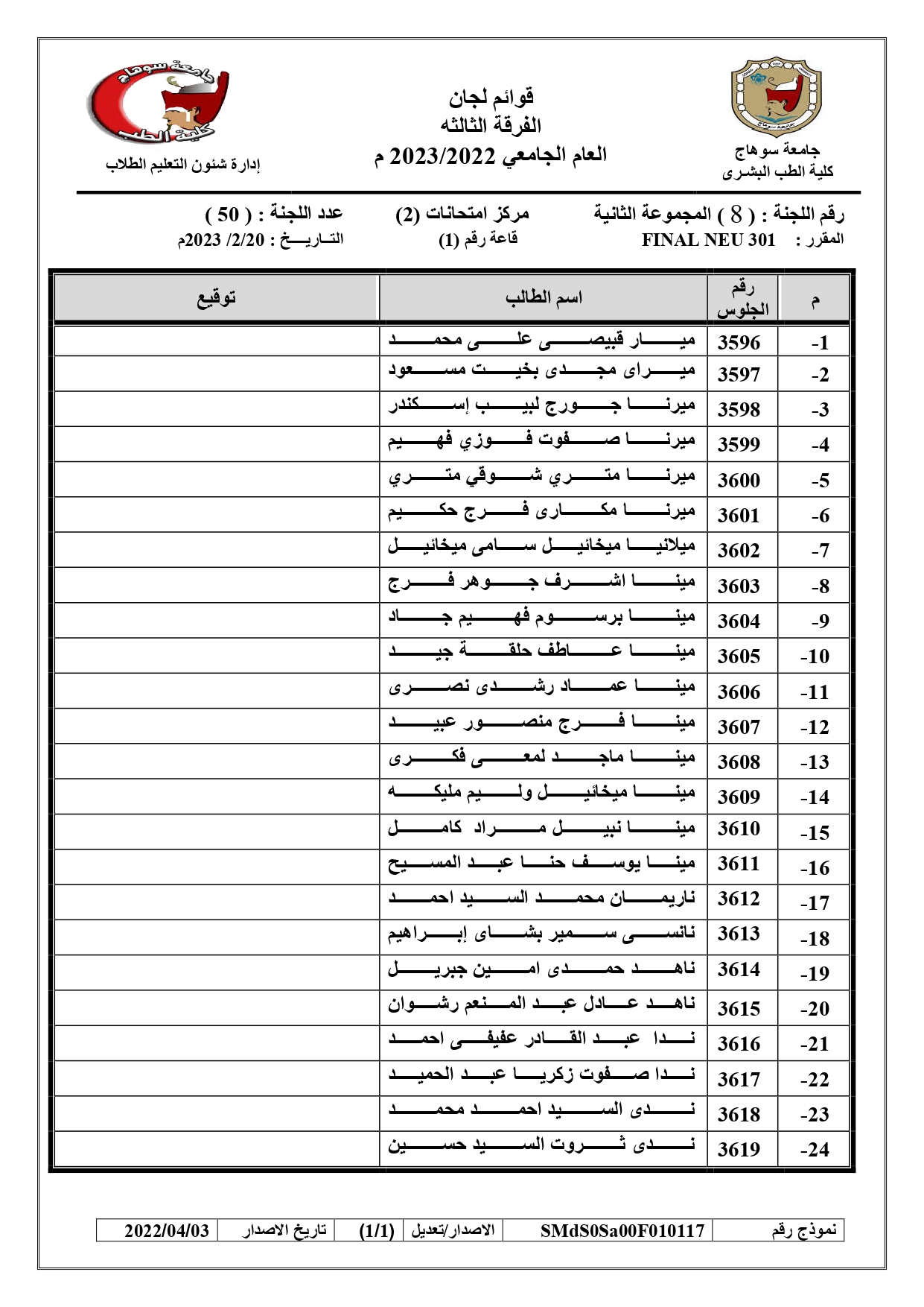 قوائم لجان امتحانات الفرقة الثالثة Final Block NEU-301 العام الجامعي 2022/2023