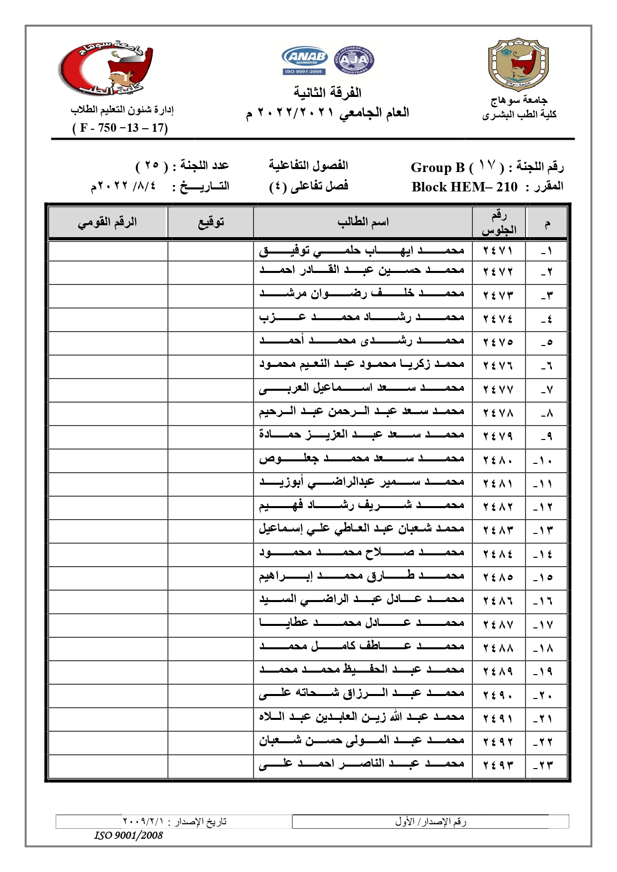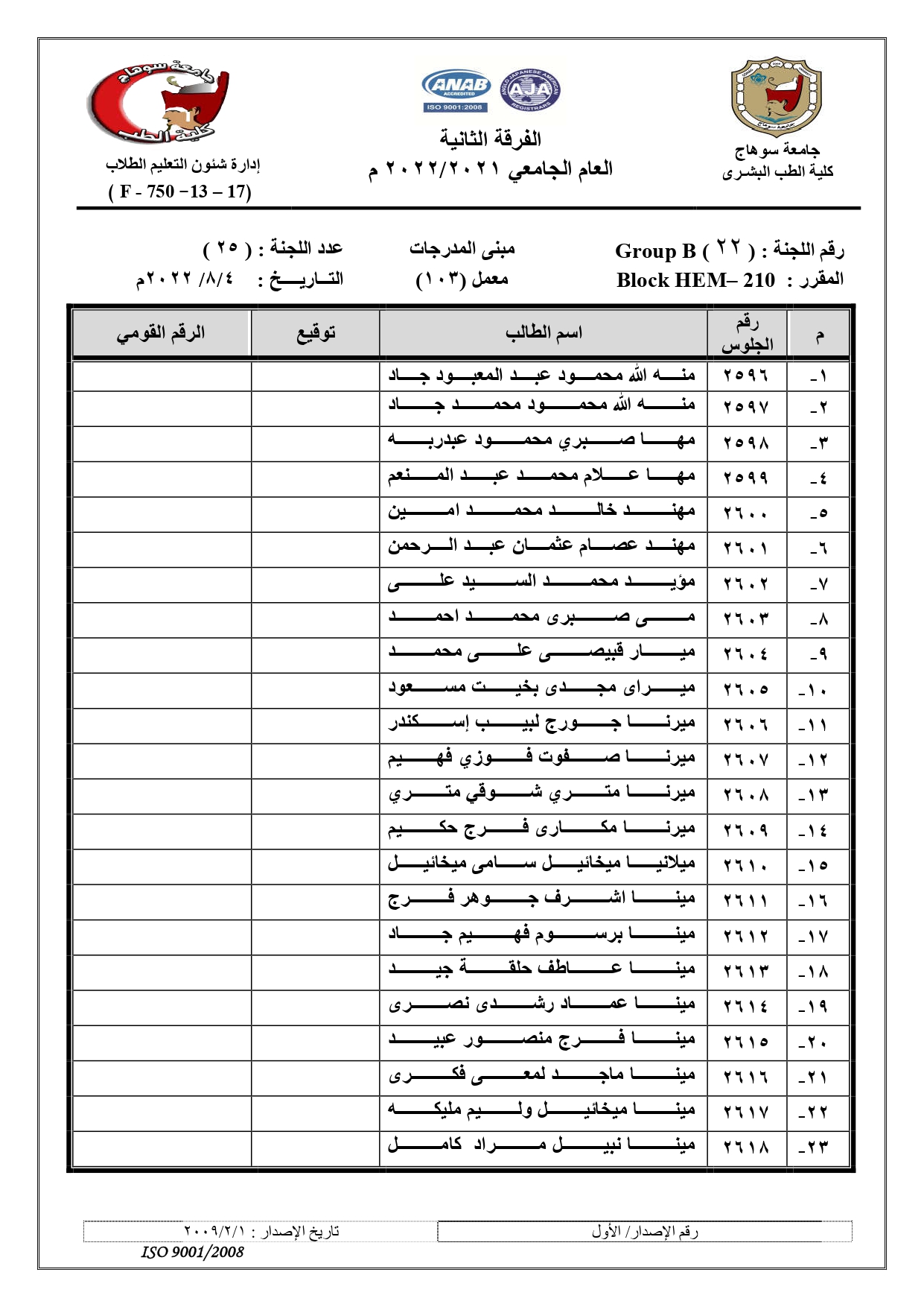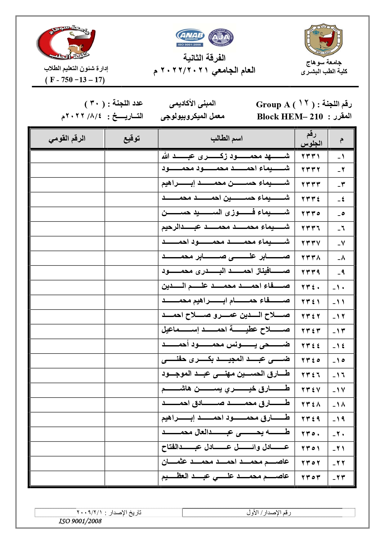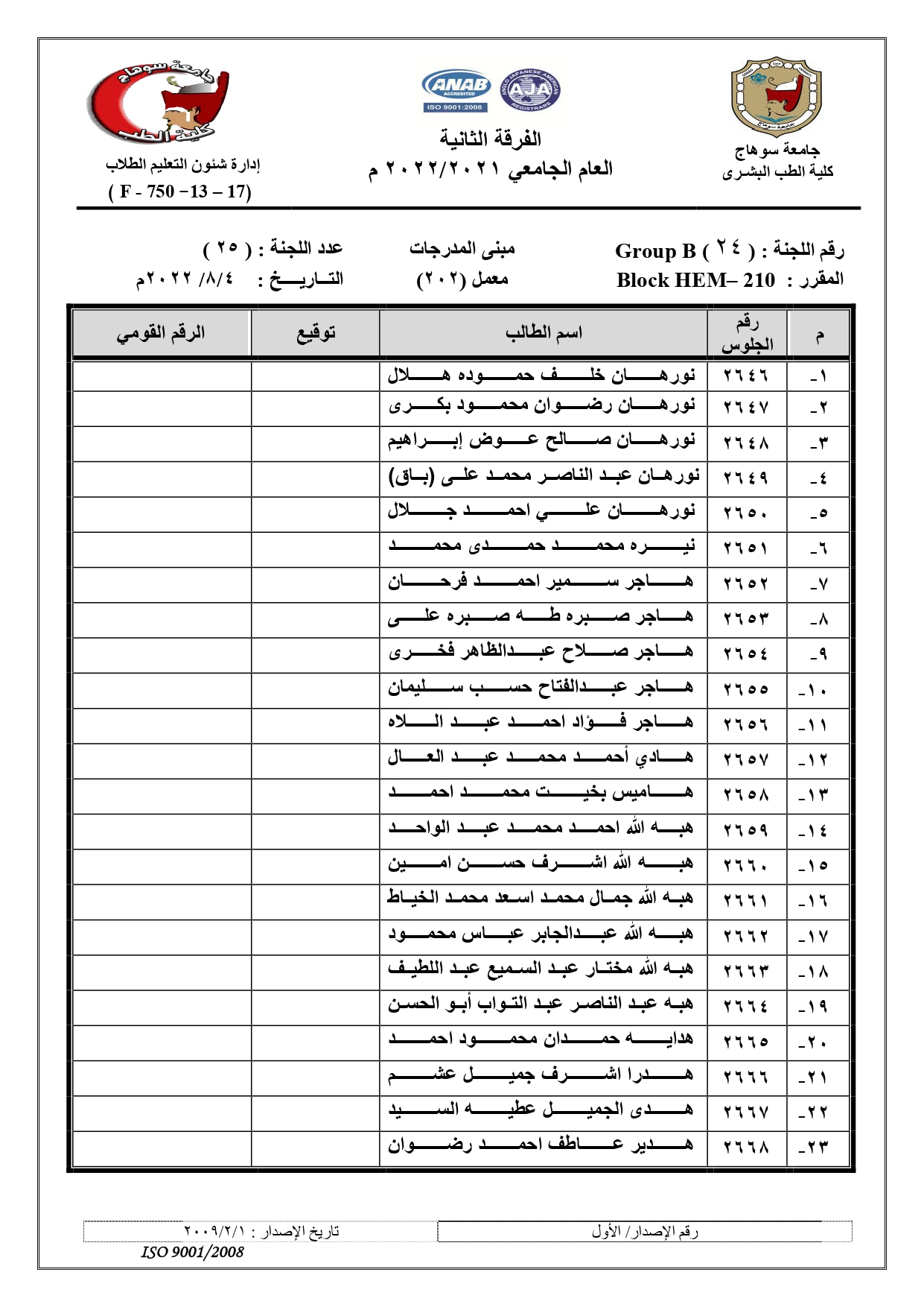 الرئيسية » Blog » قوائم لجان امتحانات الفرقة الثانية امتحان عملي (BLOCK HEM-210) العام الجامعي 2021/2022قوائم لجان امتحانات الفرقة الثانية امتحان عملي (BLOCK HEM-210) العام الجامعي 2021/2022by كلية الطب2022-08-012022-08-01