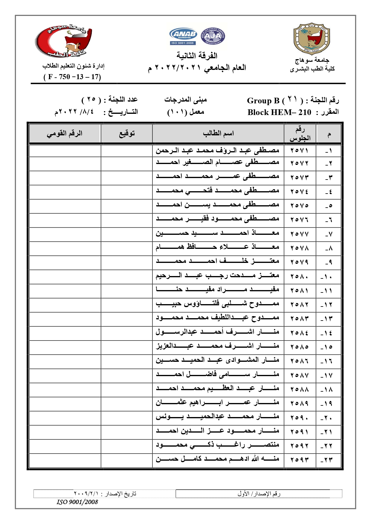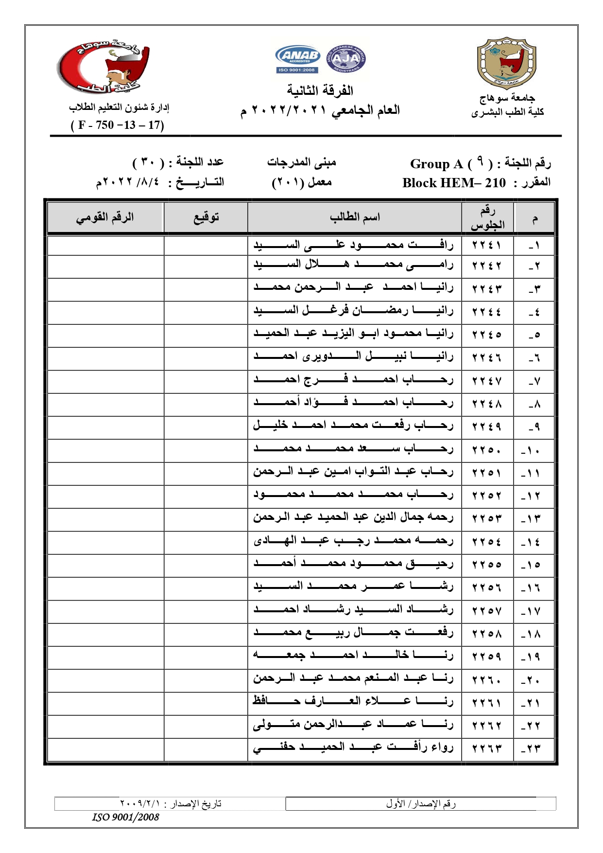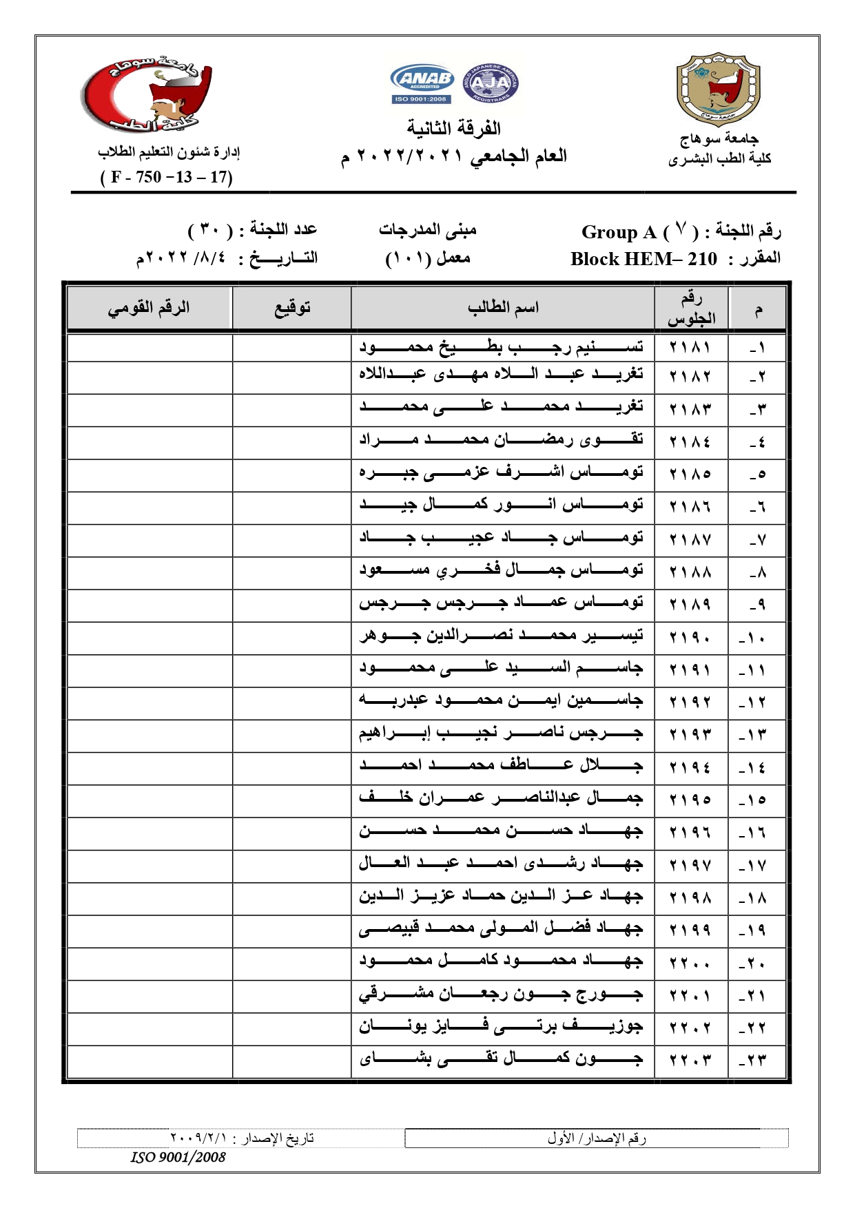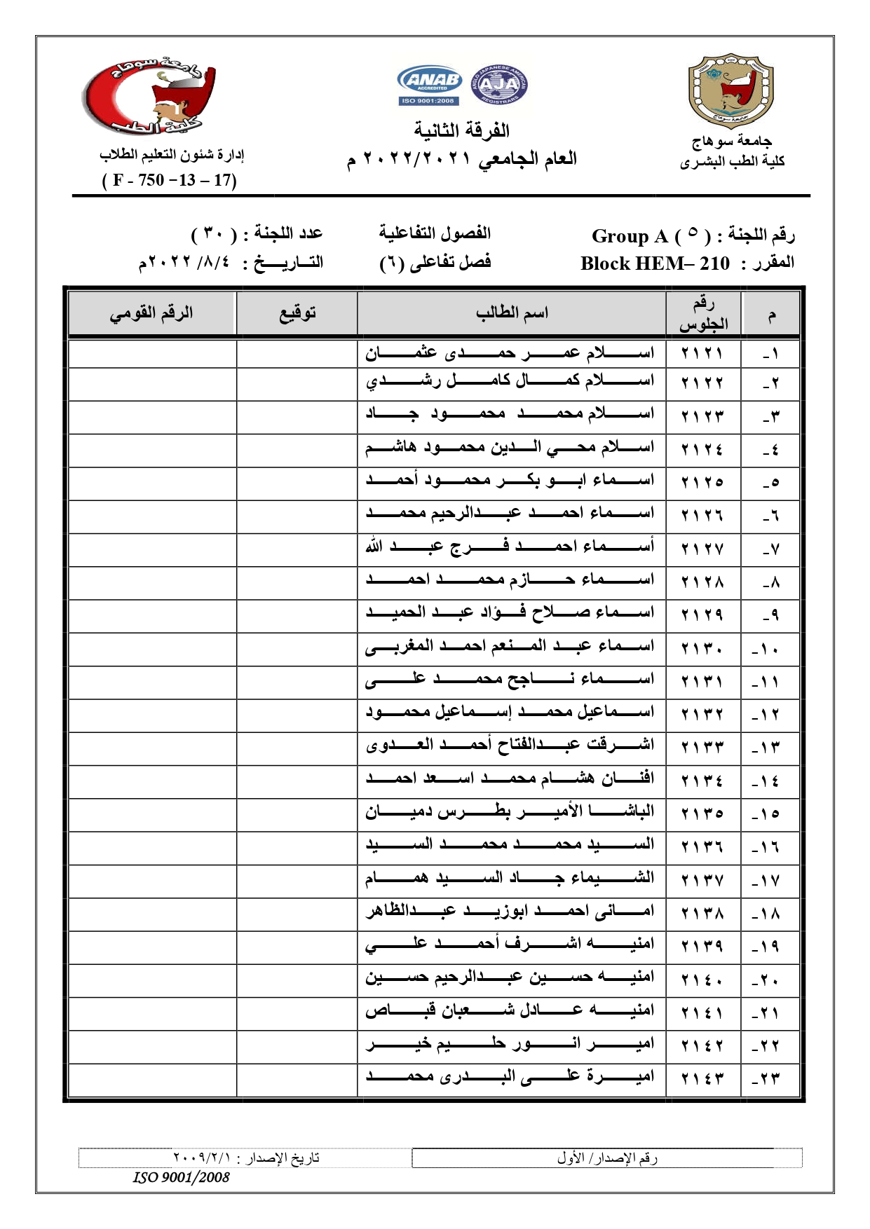 الرئيسية » Blog » قوائم لجان امتحانات الفرقة الثانية امتحان عملي (BLOCK HEM-210) العام الجامعي 2021/2022قوائم لجان امتحانات الفرقة الثانية امتحان عملي (BLOCK HEM-210) العام الجامعي 2021/2022by كلية الطب2022-08-012022-08-01