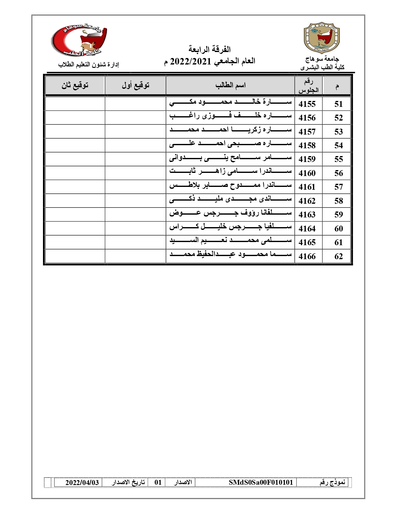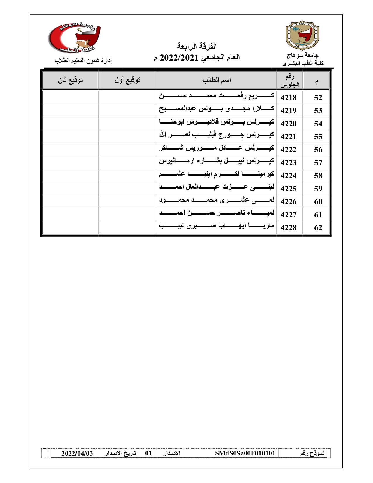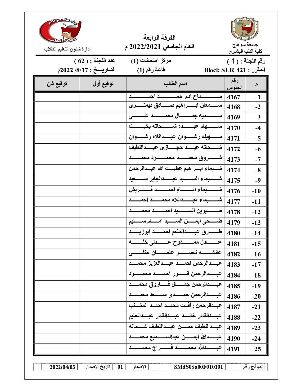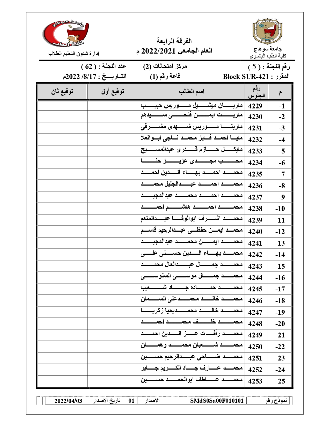 قوائم لجان امتحانات الفرقة الرابعة امتحان (BLOCK SUR – 421) العام الجامعي 2021/2022