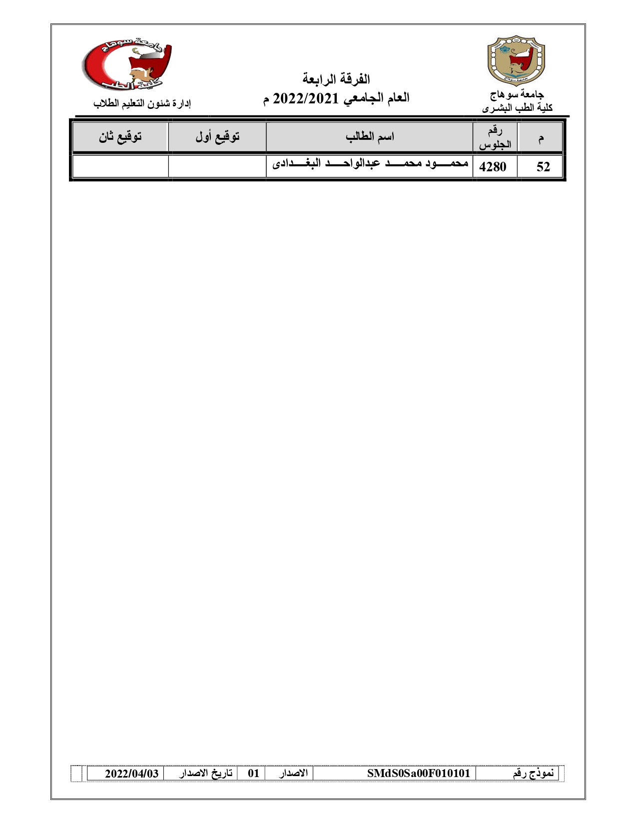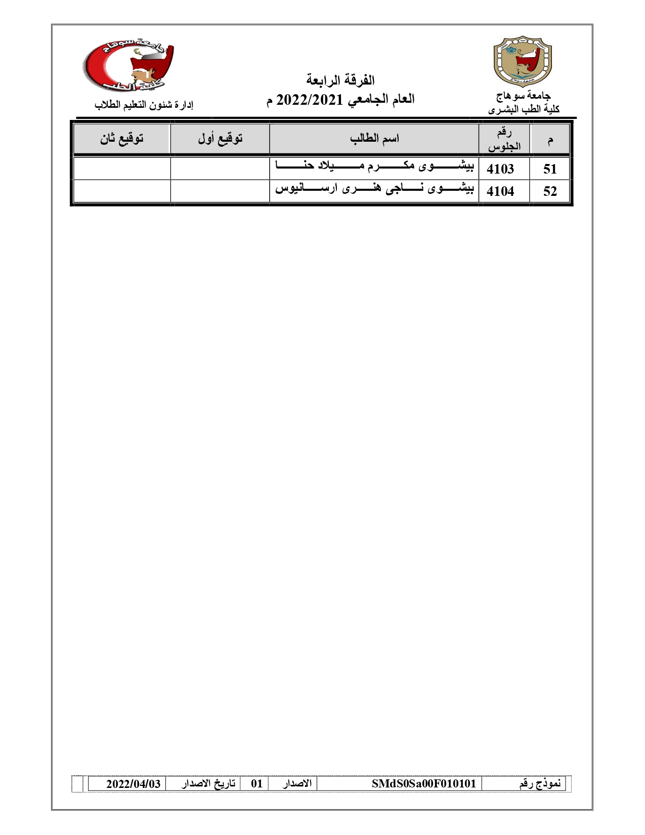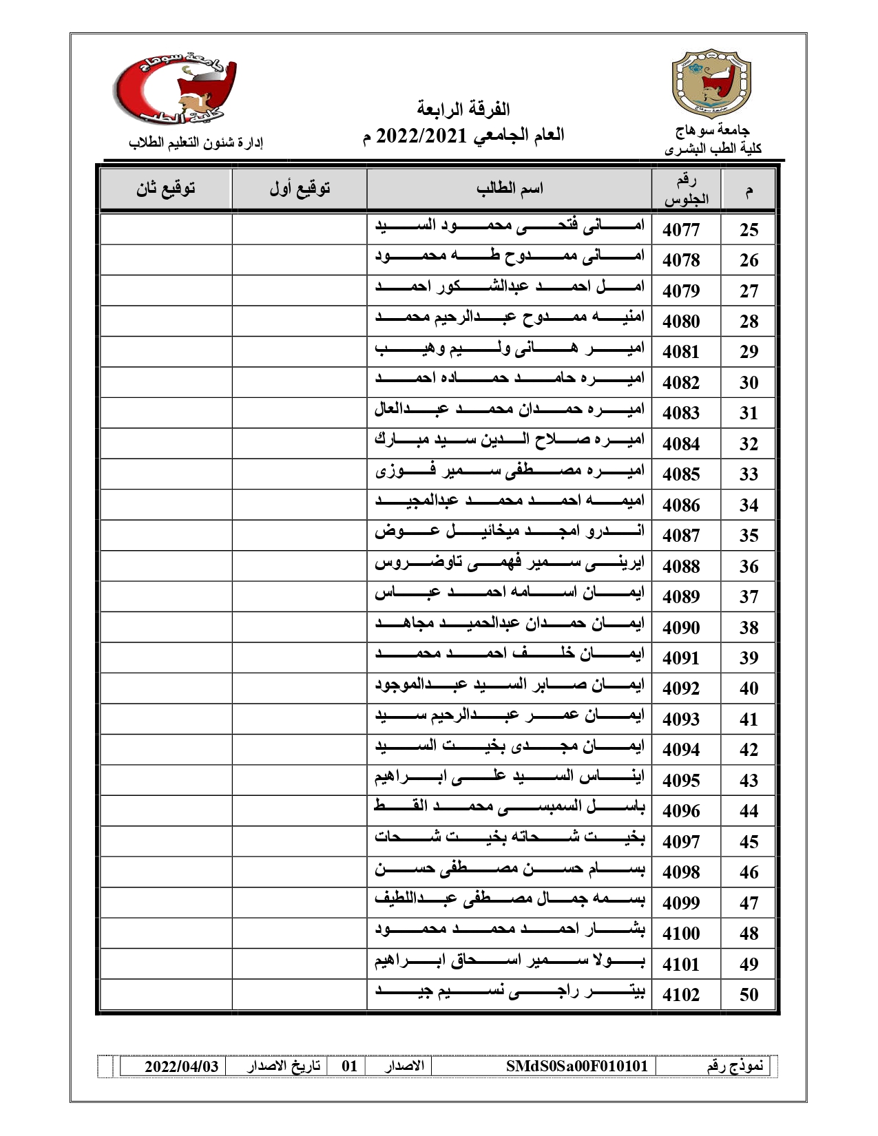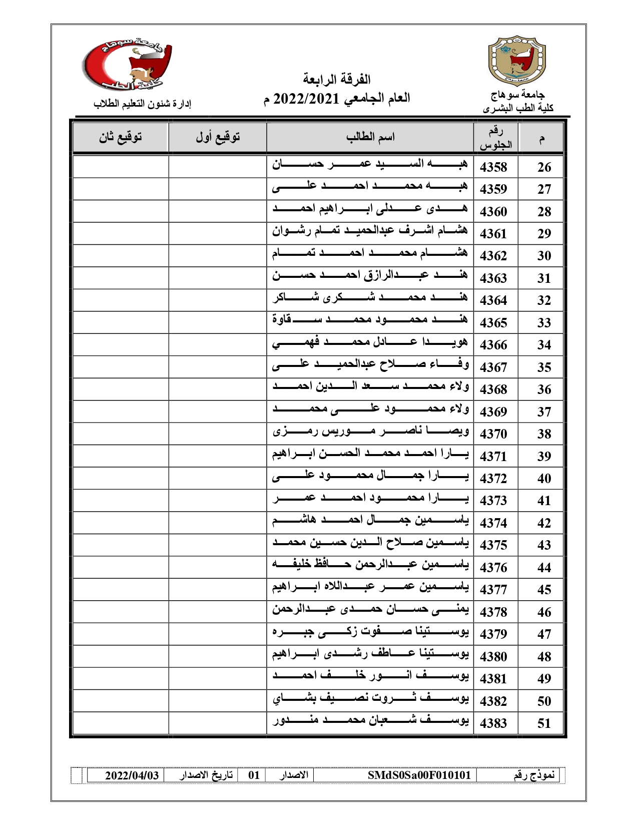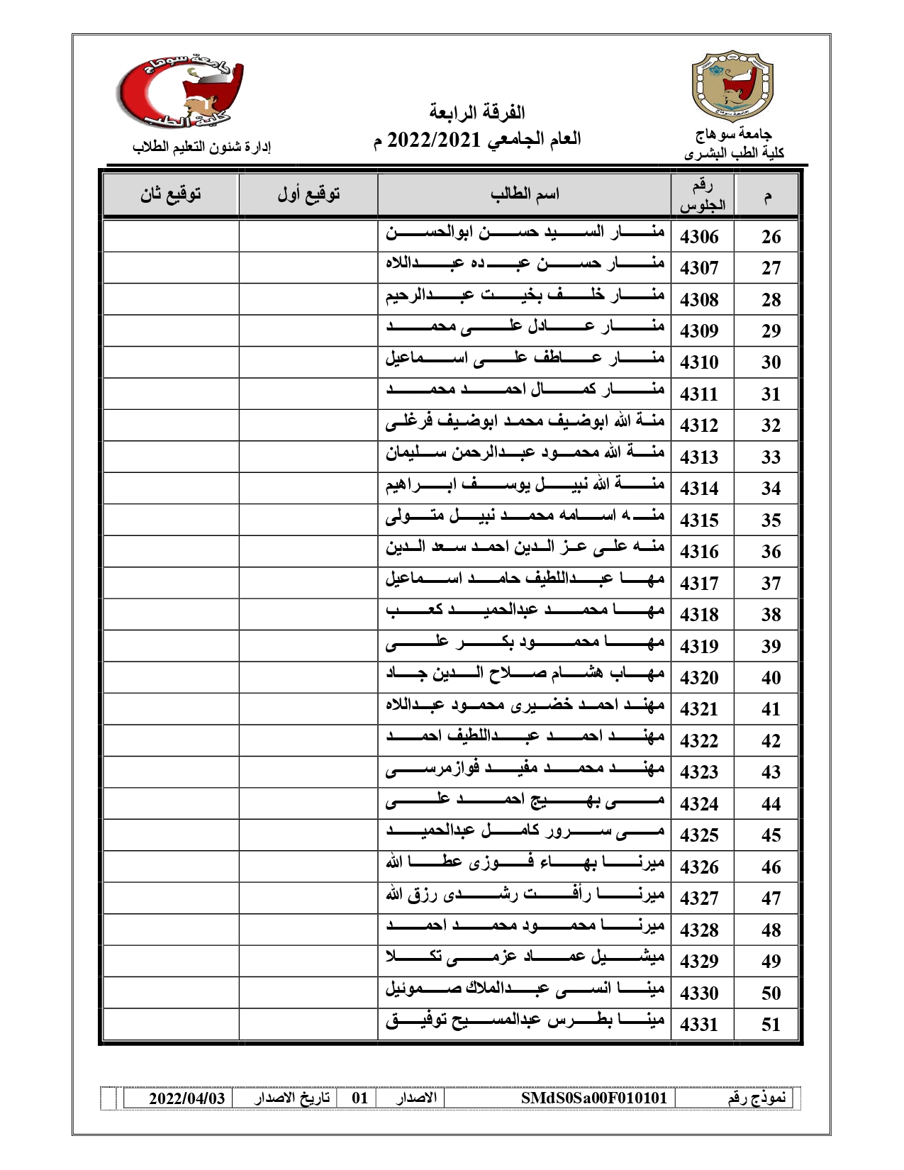 قوائم لجان امتحانات الفرقة الرابعة امتحان (BLOCK SUR – 421) العام الجامعي 2021/2022