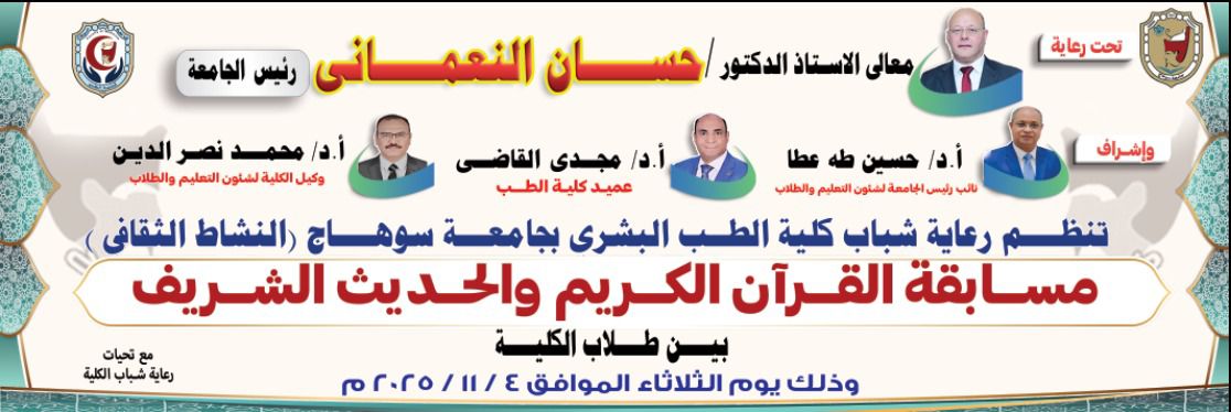 في إطار حرص إدارة رعاية الشباب بكلية الطب البشري على تنمية الجوانب الدينية والثقافية لدى طلابها، تُنظَّم غدًا الثلاثاء الموافق ٤ نوفمبر مسابقة في تلاوة القرآن الكريم والحديث الشريف، بمشاركة أكثر من ٢٥ طالبًا وطالبة من مختلف الفرق الدراسية.