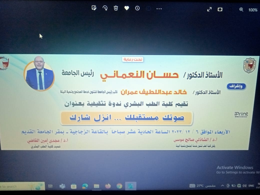 أقامت كلية الطب البشري ( قطاع خدمة المجتمع وتنمية البيئة ) اليوم الأربعاء ٦/ ١٢/ ٢٠٢٣ م ندوة تثقيفية بعنوان ” صوتك مستقبلك .. انزل شارك “