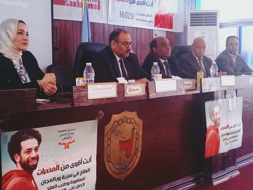 وفي كلمة د/ محمد نصر .. ذكر بأن الإدمان والتعاطي هو عبارة عن حالة معقدة تنطوي نحو إتباع سلوك منحرف وحذر شباب الجامعة من أنه مرض مزمن يصيب خلايا المخ مما يؤدي إلي عدم الاتزان وأنه ليس فقط يؤثر علي الفرد بل المجتمع ككل .