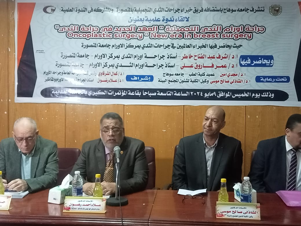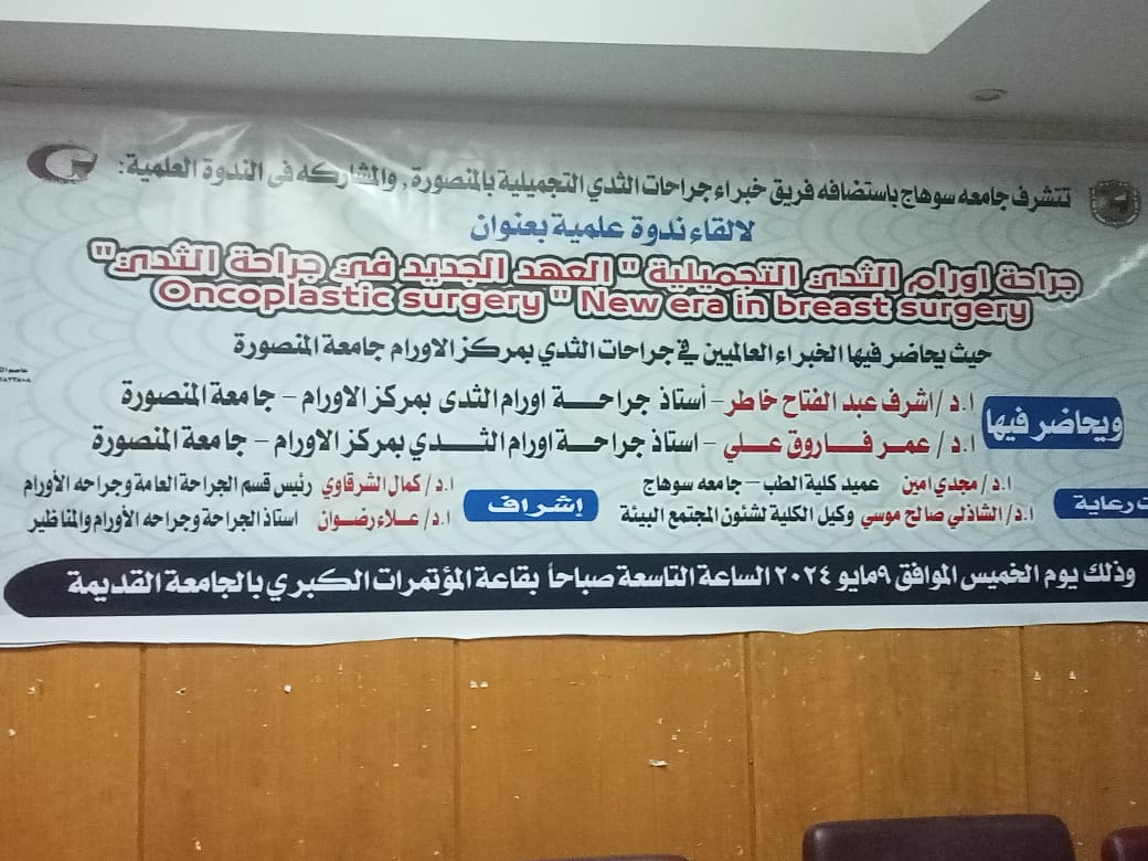 أقيم اليوم الخميس ٩/ ٥/ ٢٠٢٤م ندوة علمية بعنوان ” جراحة أورام الثدي التجميلية ” والتي حاضر فيها فريق من خبراء جراحات الثدي بجامعة المنصورة : –