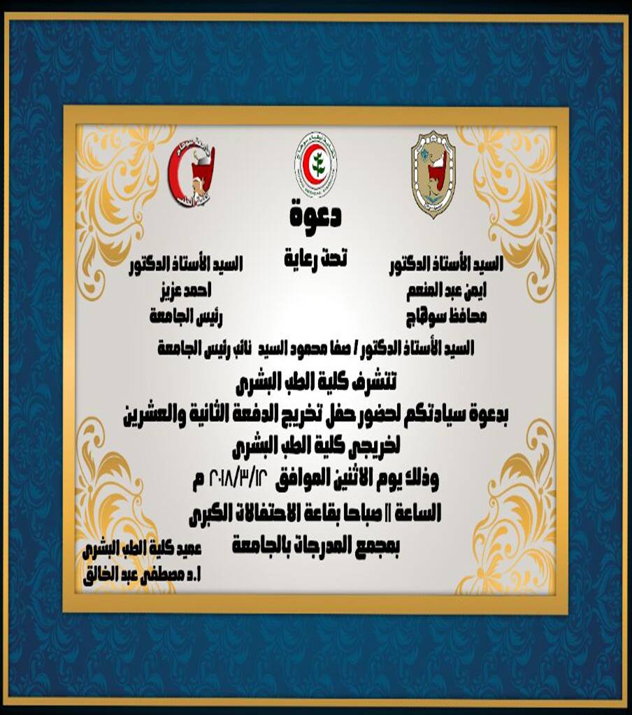 تتشرف كلية الطب جامعة سوهاج بدعوة سيادتكم لحضور حفل تخرج الدفعة الثانية والعشرون بالكلية وذلك في تمام الساعة الحادية عشر صباحاً من يوم الاثنين الموافق… Read More »دعوة عامة