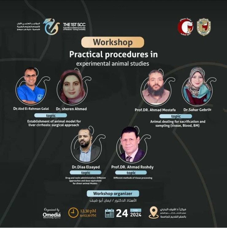 Under the patronage of Prof. Dr. Hassan Al-Nomani, President of the University, Prof. Dr. Magdy Amin Al-Qadi, Dean of the Faculty of Medicine, and Prof. Dr. Al-Shazly Saleh, Vice Dean of the Faculty of Medicine for Community Service and Environmental Development Affairs, Prof. Dr. Ashraf Al-Badry Center for Experimental Surgery held a training workshop for researchers from the faculty members and the supporting staff under the supervision of Prof. Dr. Eman Al-Sayed Abu Deif, Chairman of the Center’s Board of Directors. Forty trainee researchers from the faculty and supporting staff attended.