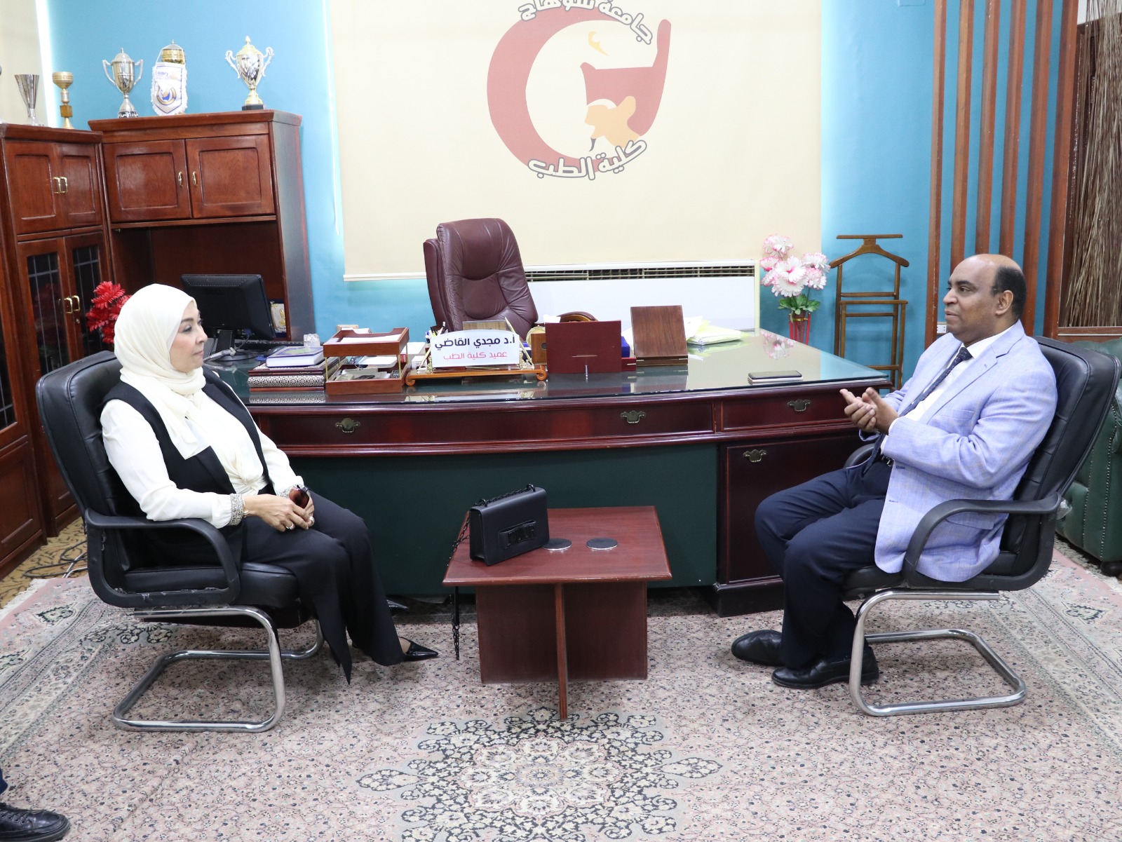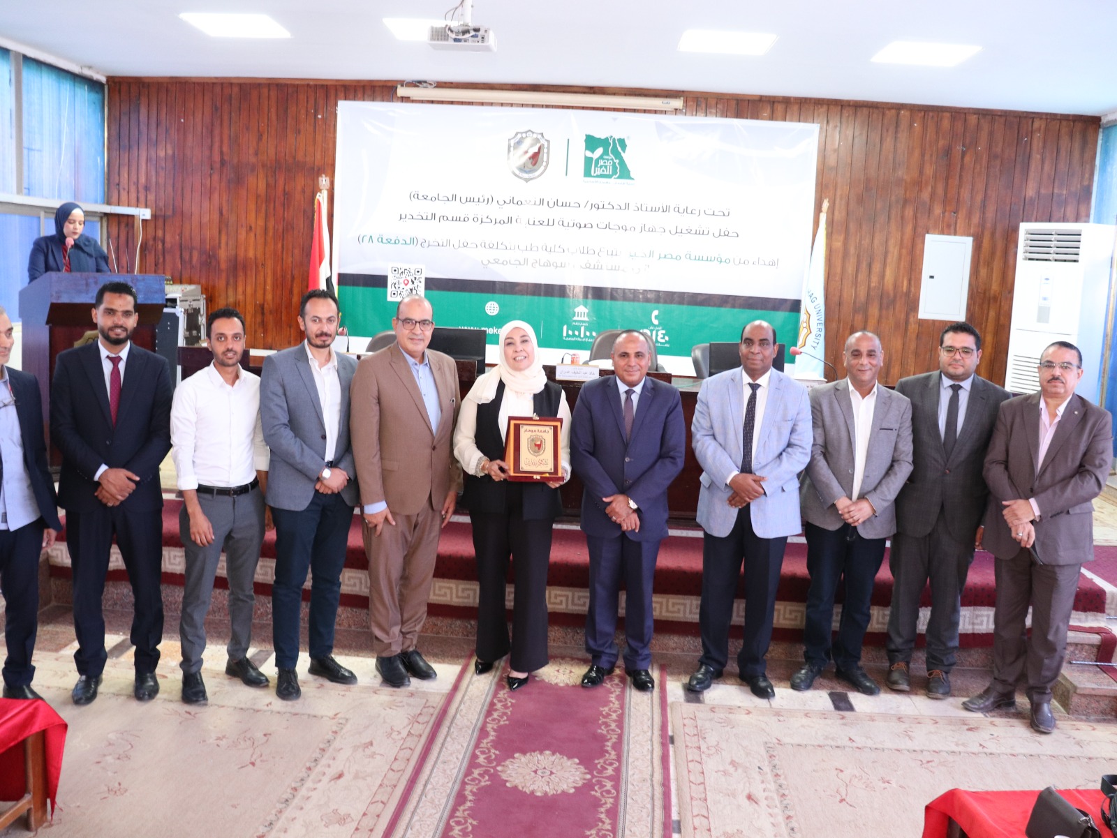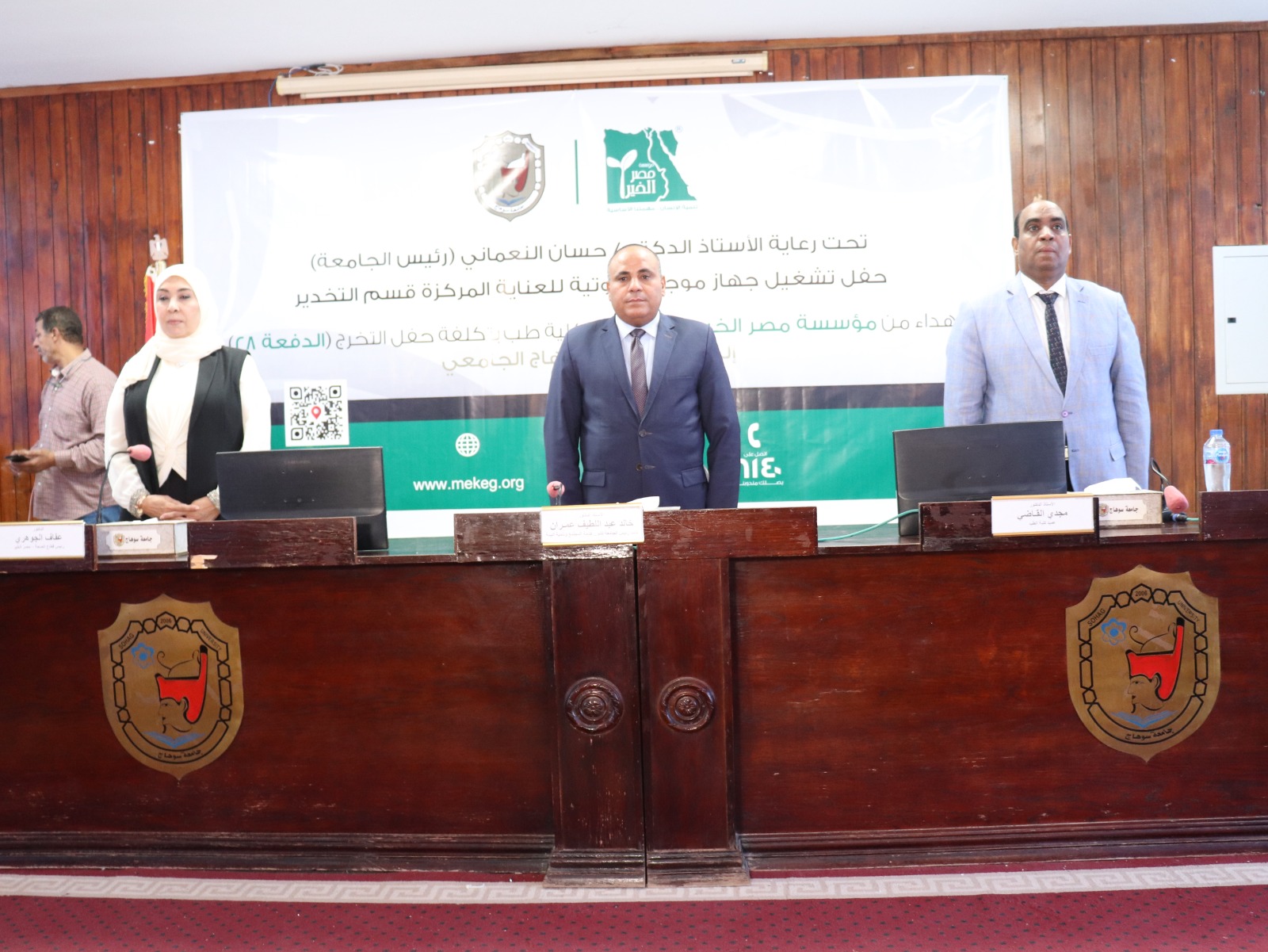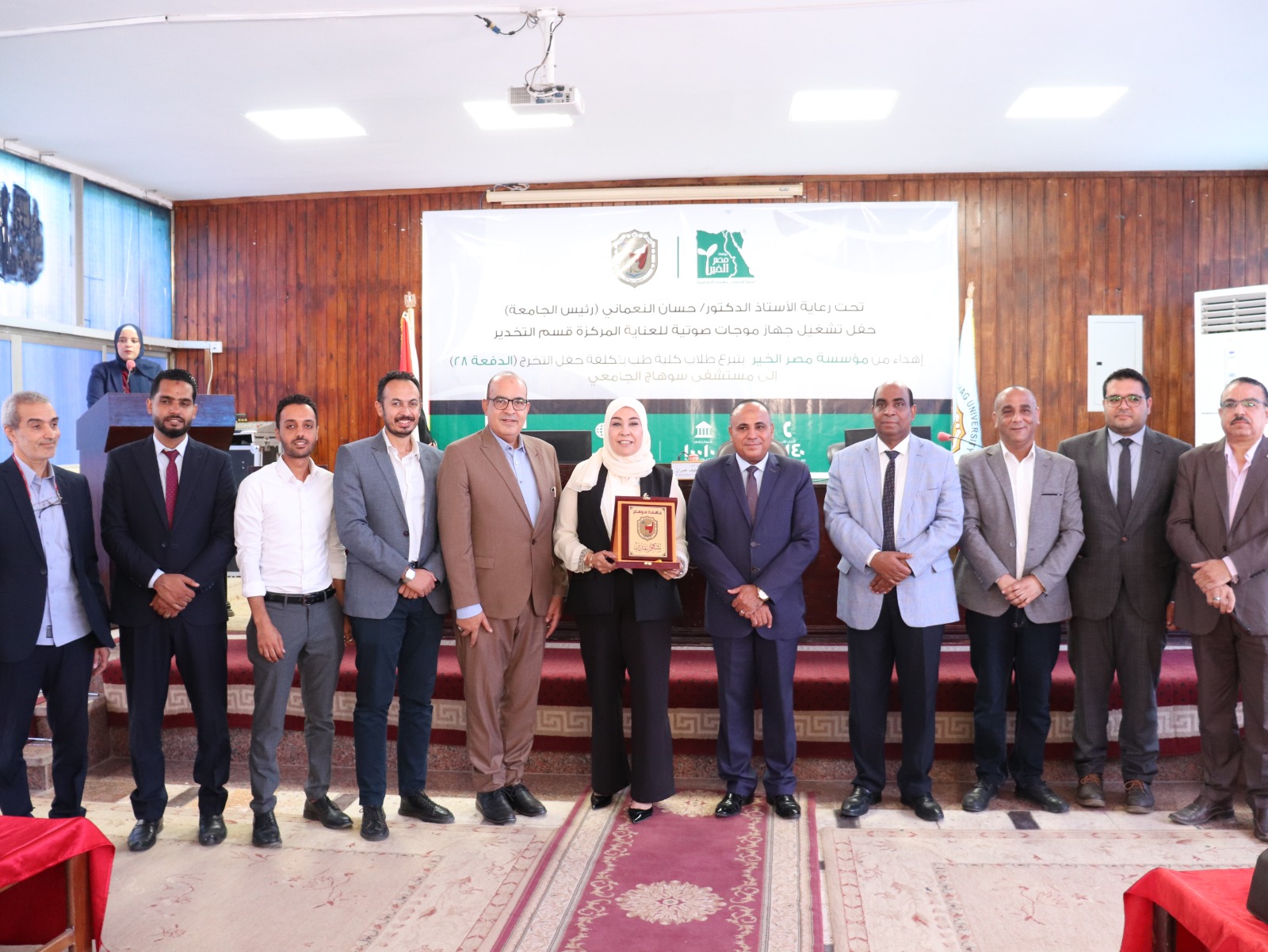 The Faculty of Medicine at Sohag University organized a ceremony to operate an intensive care sound wave device in the Department of Anesthesia at the University Hospital, provided as a donation from Misr El-Kheir Foundation, and a contribution from the students of the 28th batch of the Faculty of Medicine, to serve intensive care patients. In the presence of Dr. Khaled Omran, Vice President for Environmental Development and Community Service, Dr. Magdy El-Kady, Dean of the Faculty, Dr. Afaf El-Gohary, Head of the Health Sector at Misr El-Kheir Foundation, and a number of faculty members and students, in the glass hall at the old university headquarters.