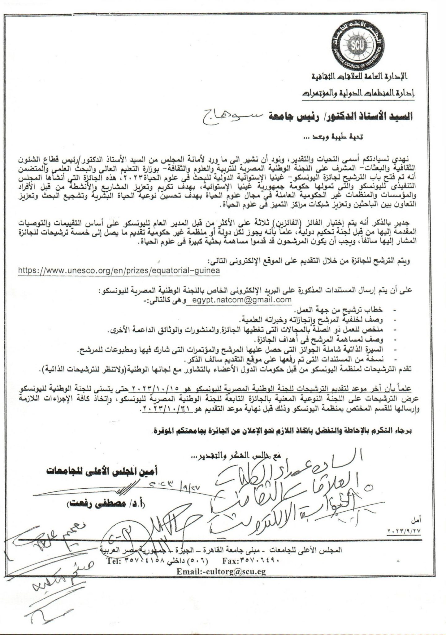 The nomination for the UNESCO – Equatorial Guinea International Prize for Research in Life Sciences 2023