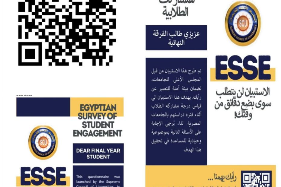 تنبيه هام جدا جدا لطلاب الفرقة الخامسة ! الرجاء سرعة الانتهاء من الاستبيان المصري للمشاركات الطلابية (للفرق النهائية) Egyptian Survey of Student Engagement https://esse.scu.eg/
