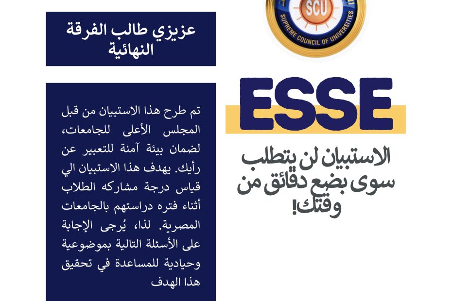 اعلان هام لطلاب الفرقة الخامسة ! الرجاء سرعة الانتهاء من الاستبيان المصري للمشاركات الطلابية (للفرق النهائية) Egyptian Survey of Student Engagement https://esse.scu.eg/