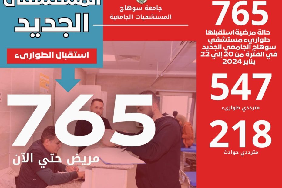 رئيس جامعة سوهاج يتابع سير عمل اليوم الأول باستقبال الطوارئ بالمستشفي الجامعي الجديد، و يطالب الجميع بالتعاون الجاد من أجل تقديم خدمات علاجية علي مستوي… Read More »رئيس جامعة سوهاج يتابع سير عمل اليوم الأول باستقبال الطوارئ بالمستشفي الجامعي الجديد